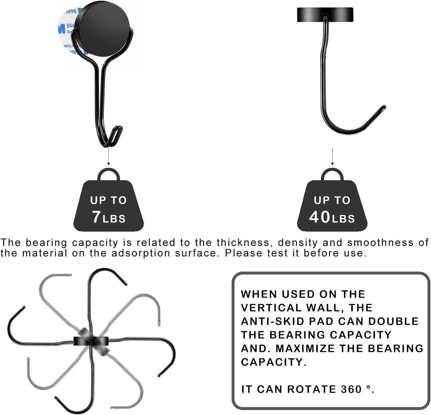 - 【Equipped with Non-slip Pad】Using with anti-slip pads which enables magnetic hook to bear more weight when use horizontally, such as refrigerators and iron doors, the load-bearing capacity can be double, so no need to worry about items slipping off. The maximum load capacity is 7LBS for vertical walls.