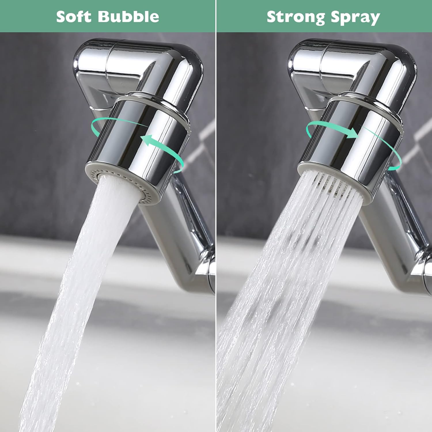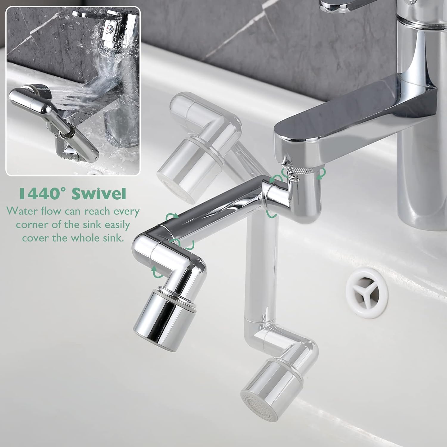 - 💧【Foldable & 1440° Swivel】Updates Based on 1080 Degree Faucet Aerator. The newly upgraded robotic arm faucet extender can rotate 1440 °, there are 4 positions to adjust the angle and each can be rotated at omnidirectional 360 degrees. It can be folded and stored. You can easily rotate the tap to the direction you want, making it more convenient to wash your face and gargle.