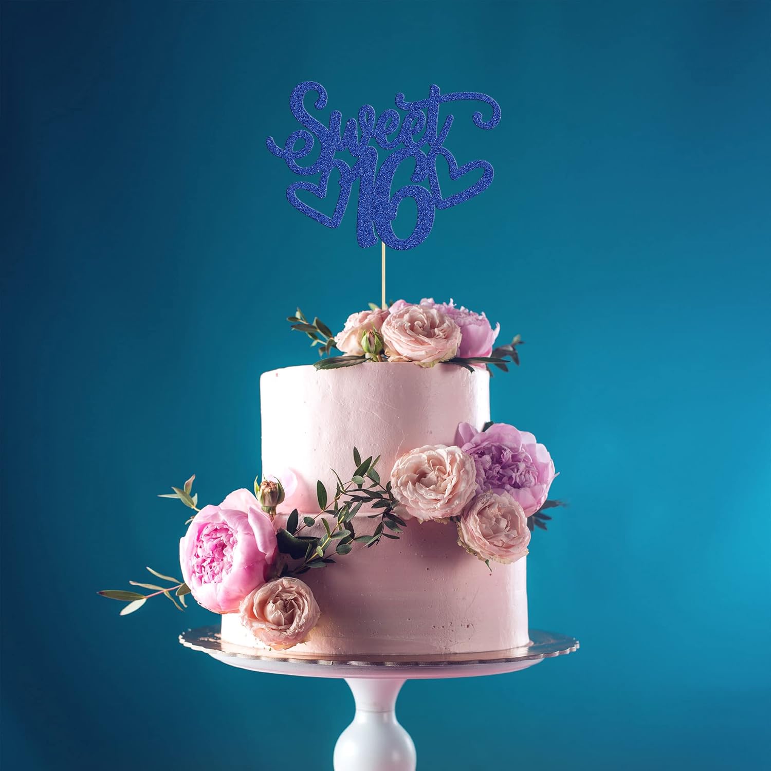 Gyufise 1Pc Sweet Teenager 16 Cake Topper Glitter 16th Birthday Cake Pick for Cheers to 16 Years Old 16th Birthday Party Cake Decorations Supplies Blue