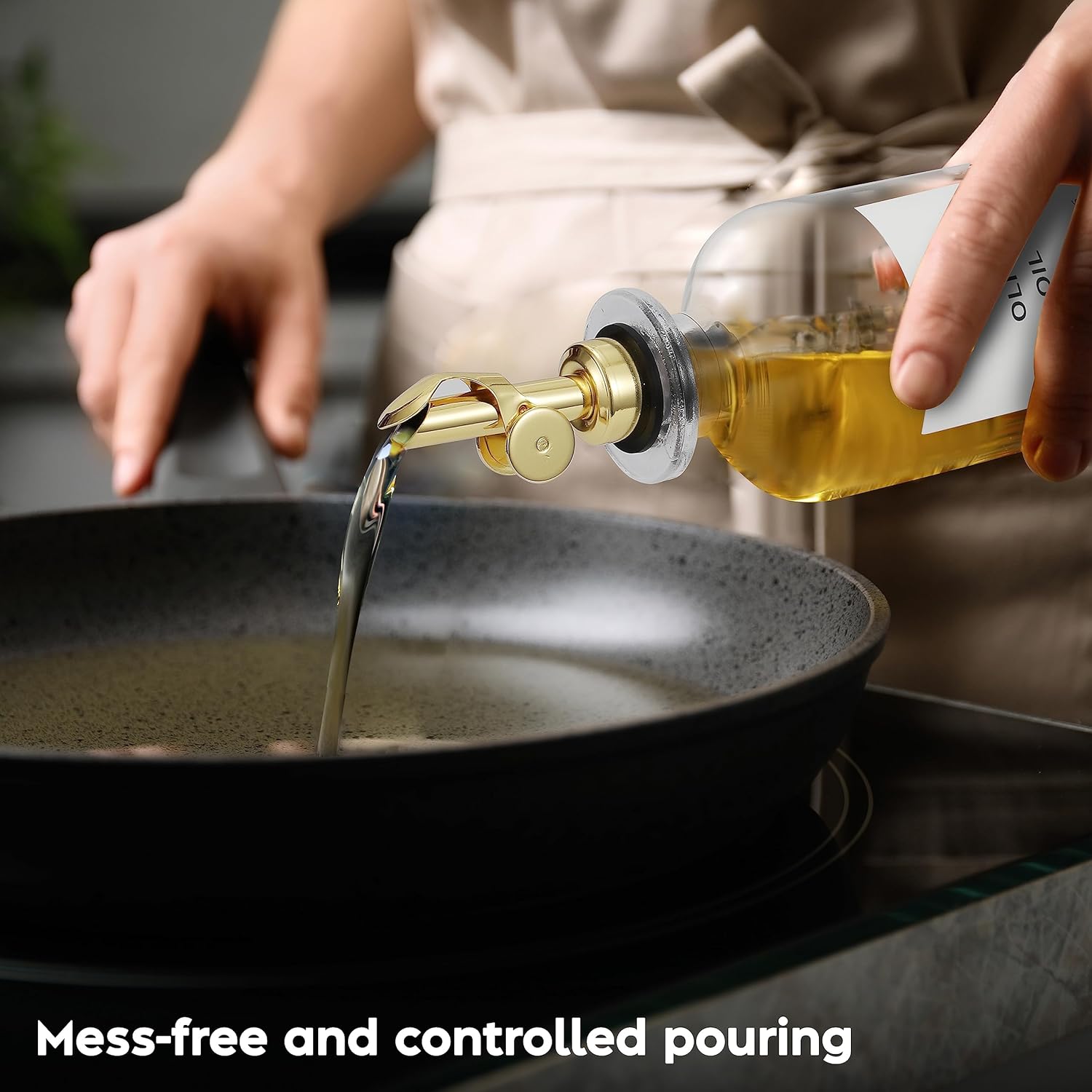 - Elegant & Aesthetically Pleasing — The minimalist and class design makes this small olive oil dispenser bottle the boost of elegance that your kitchen needs. Enjoy the modern feel of glass and gold plated stainless steel every time you cook.