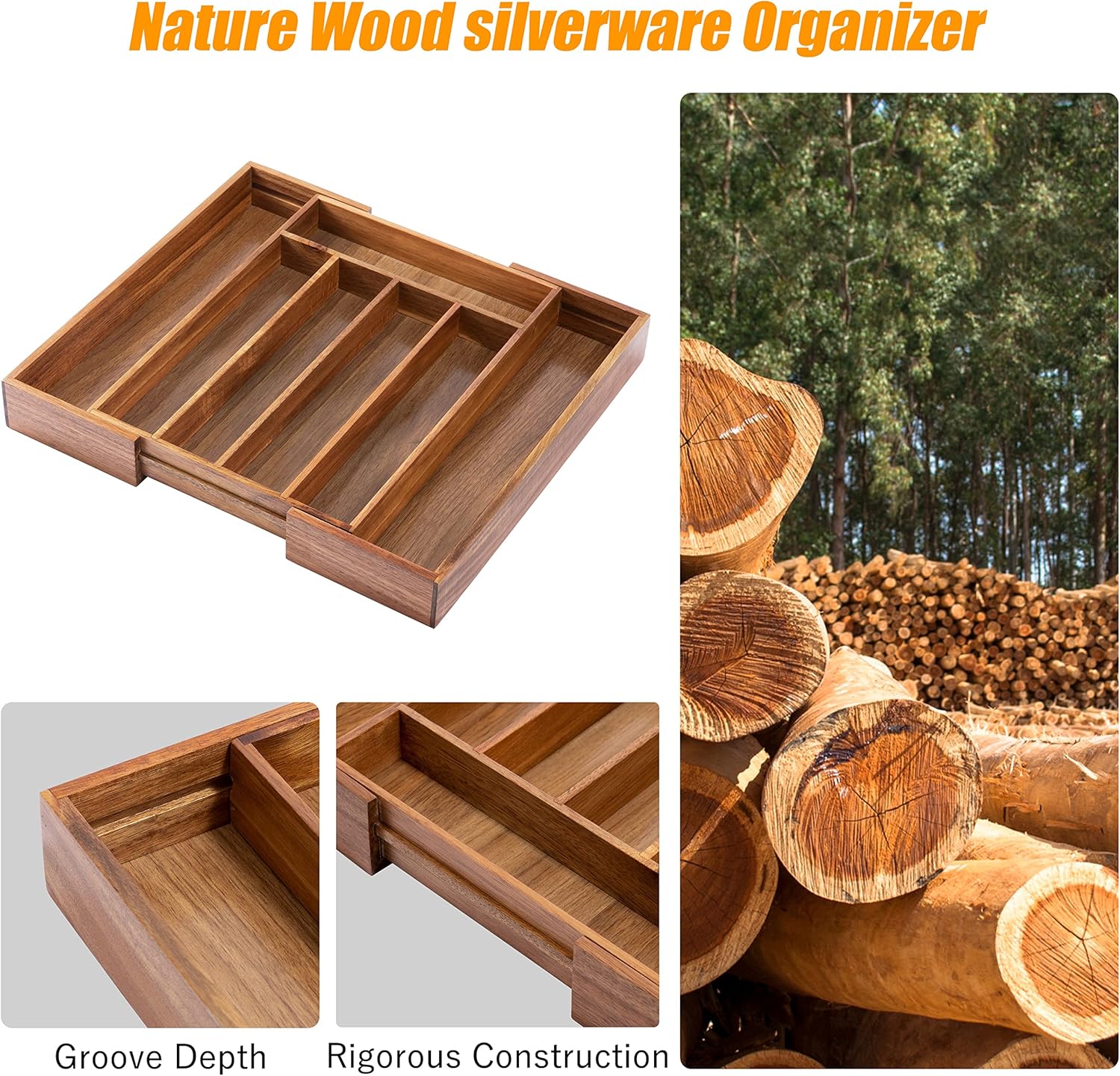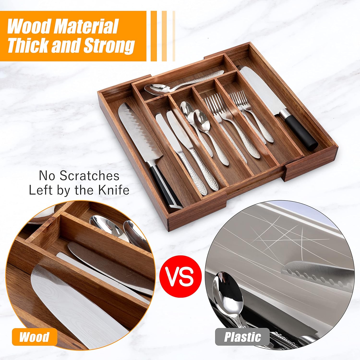 - â ăFit your drawer perfectlyăStill measuring every kitchen drawer and buying a kitchen drawer organizer of the same size? Our bamboo silverware drawer organizer is designed with 5-7 compartments. Thanks to its adjustable features, our expandable drawer organizer can be expanded from 10 to 15 inch wide, Perfect for any kitchen drawers.
