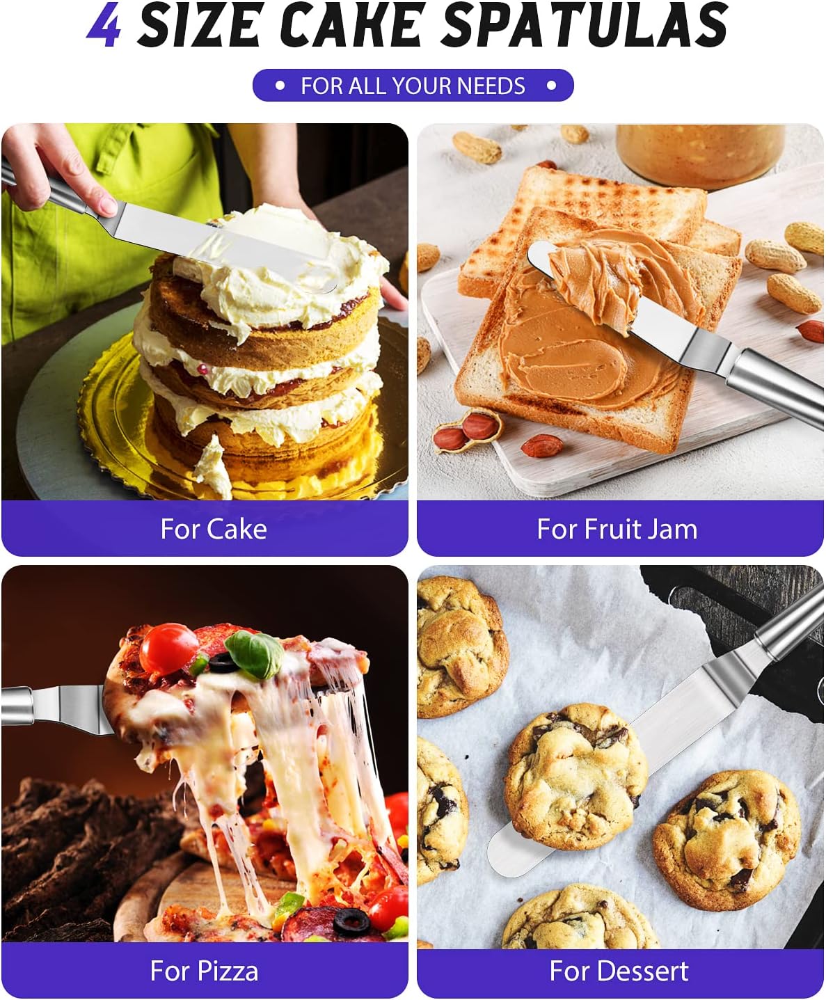 - ERGONOMIC DESIGN: Cake spatula great for frosting and smoothing icing on cakes to keep your hands and finger away from the icing. Angled spatula is great for releasing the edges and applying frosting to the sides. Besides, we take into account different ages and cake sizes, this set includes 4 different sizes to meet your various needs