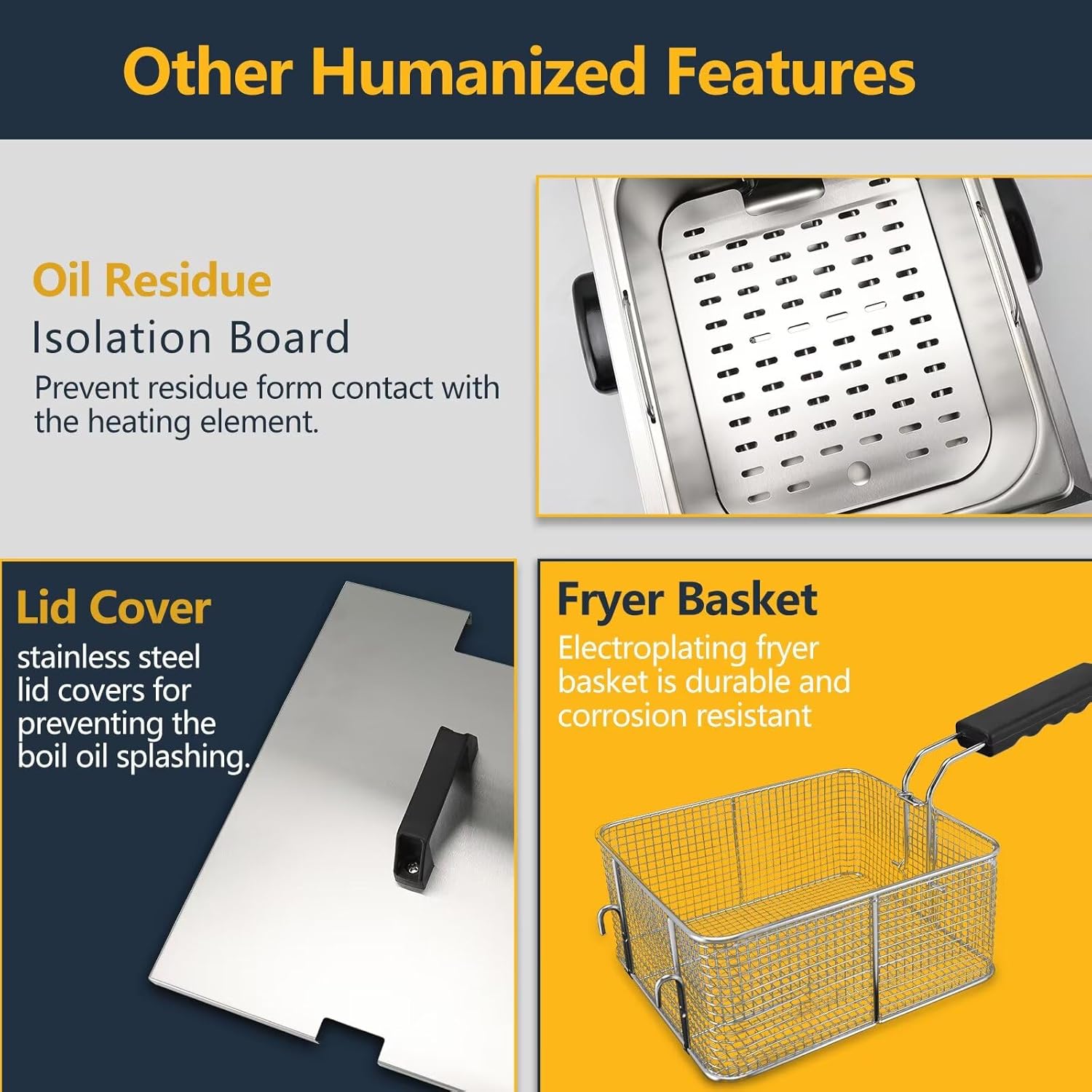 - 🍕【DURABLE & LARGE CAPACITY】This fryer is made of heavy duty 0.6 mm thickened stainless steel for enhanced durability, sturdiness and corrosion resistance;comes with a tight-sealing 13.6QT oil tank with a recommended oil capacity of up to 6.5QT(6L), along with a frying basket that can hold about 5 pairs of wings or 3Lbs chips, perfect for frying a wide variety of food items for home cooked meals, family gatherings and small businesses.For safety, please do not fill the basket more than halfway.