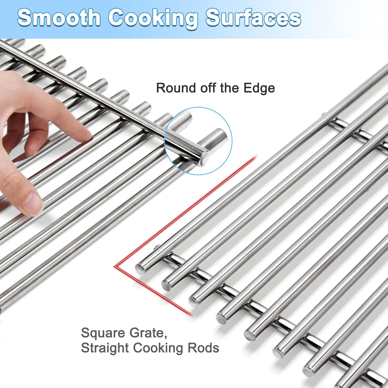 - Solid Stainless: This weber grill grate is made of premium stainless steel, perfect for your weber and passed the magnet test for stainless, 7MM heavy duty solid stainless steel grates, resist corrosion, heat resistance, more durable and last longer, no need to replace your cooking grid grate again and again.