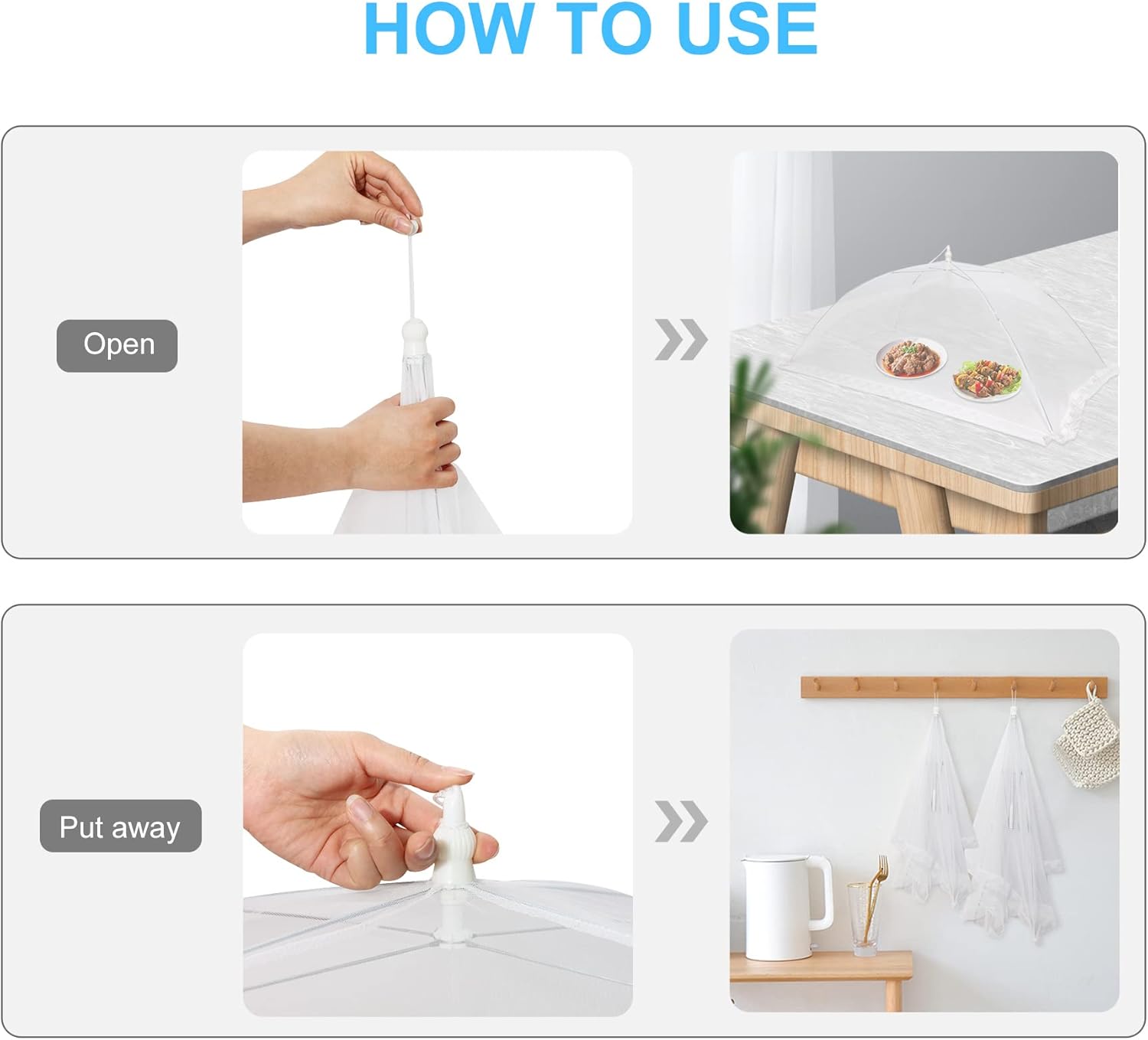 - USE ALL YEAR ROUND, EASY TO STORE: The large Pop-Up Mesh Screen Food Cover Tent is a very ingenious umbrella design, which is very easy to pop up and fold for easy storage, preventing curious cats and children from eating unprepared dishes, and making everything more relaxed and pleasant. Suitable for birthday parties, swimming pool parties, barbecue cooking, camping picnics or DIY outdoor party supplies.