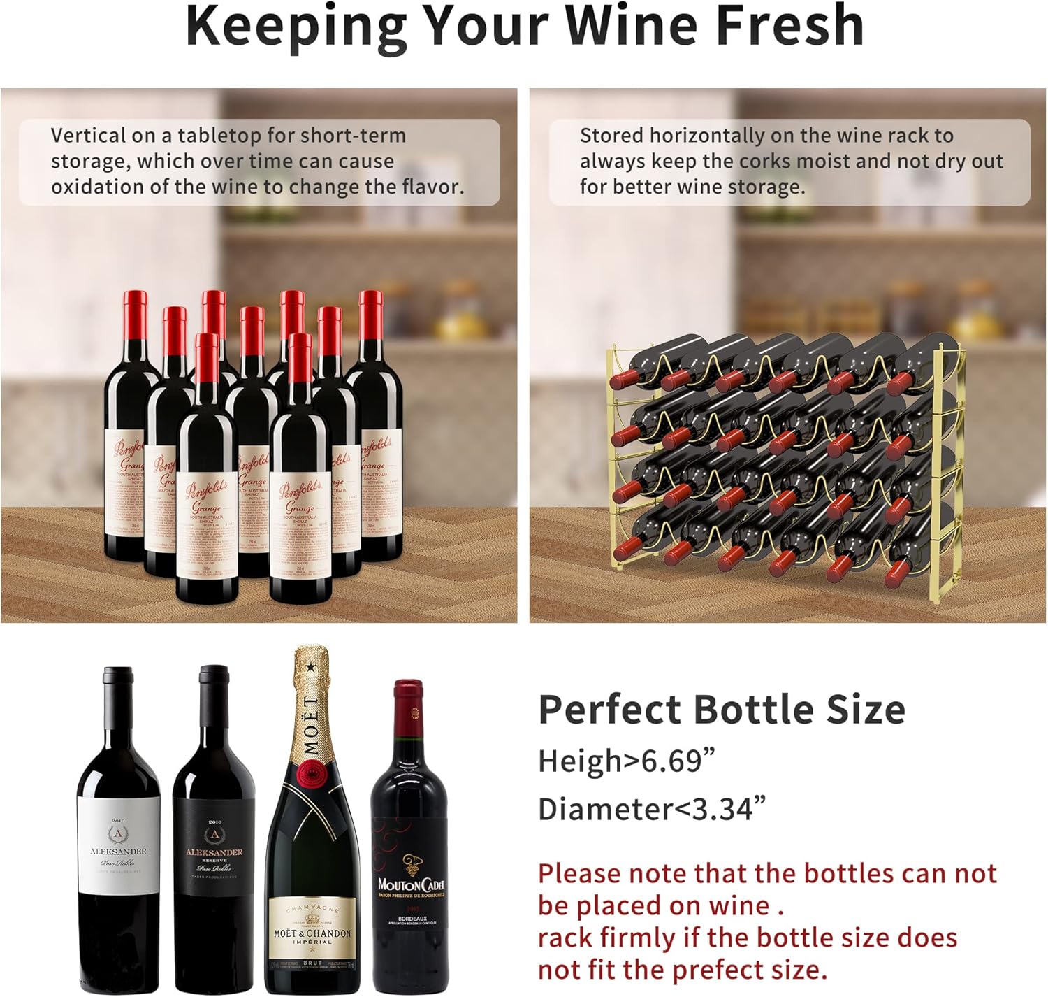 - ăLarge CapacityăSize: 24.9''L x 6.7''W x 16.5 ''H, this countertop wine rack can hold up to 24 standard wine bottles. Also the horizontal storage method ensures that the wine is in contact with the cork, keeping the cork moist and allowing the wine to be stored for longer until you are ready to enjoy it.
