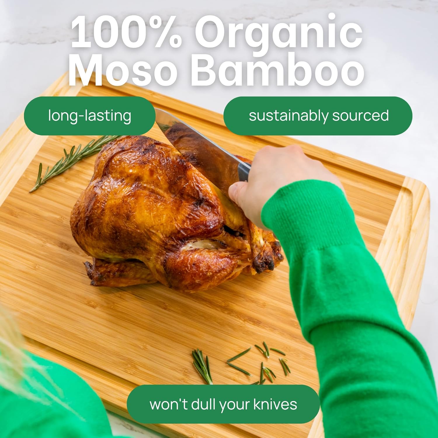 - Our bamboo cutting board is the embodiment of our commitment to sustainability and customer satisfaction. Designed in the USA, it’s made from sustainably sourced Moso Bamboo, reflecting our dedication to environmentally friendly kitchenware. Ideal for home chefs and professional kitchens, this cutting board represents a blend of quality and responsibility, making it a perfect addition to kitchens that value both function and eco-consciousness.