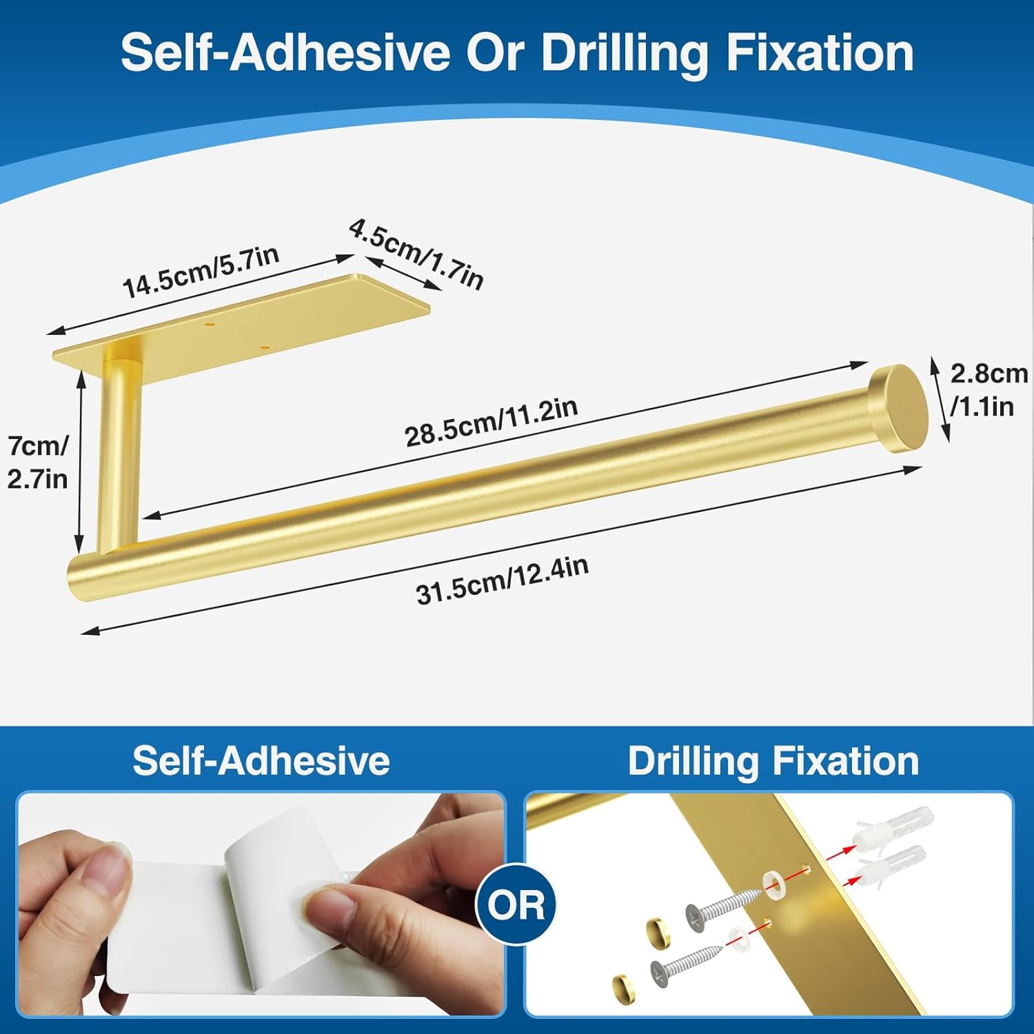 Paper Towel Holder - Self-Adhesive or Drilling, Gold, Wall Mounted, SUS304 Stainless Steel Kitchen Roll Dispenser Under Cabinet