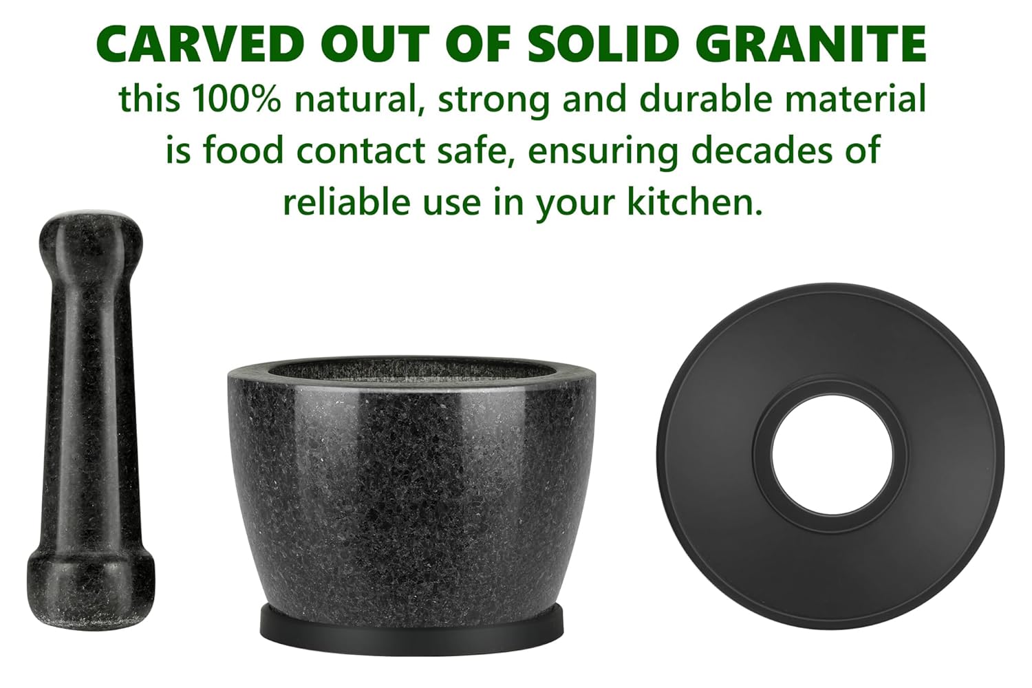 - The mortar and pestle are 100% natural, carved from a solid block of granite. Durable and sturdy, food-safe and ensures reliable use in the kitchen for decades.