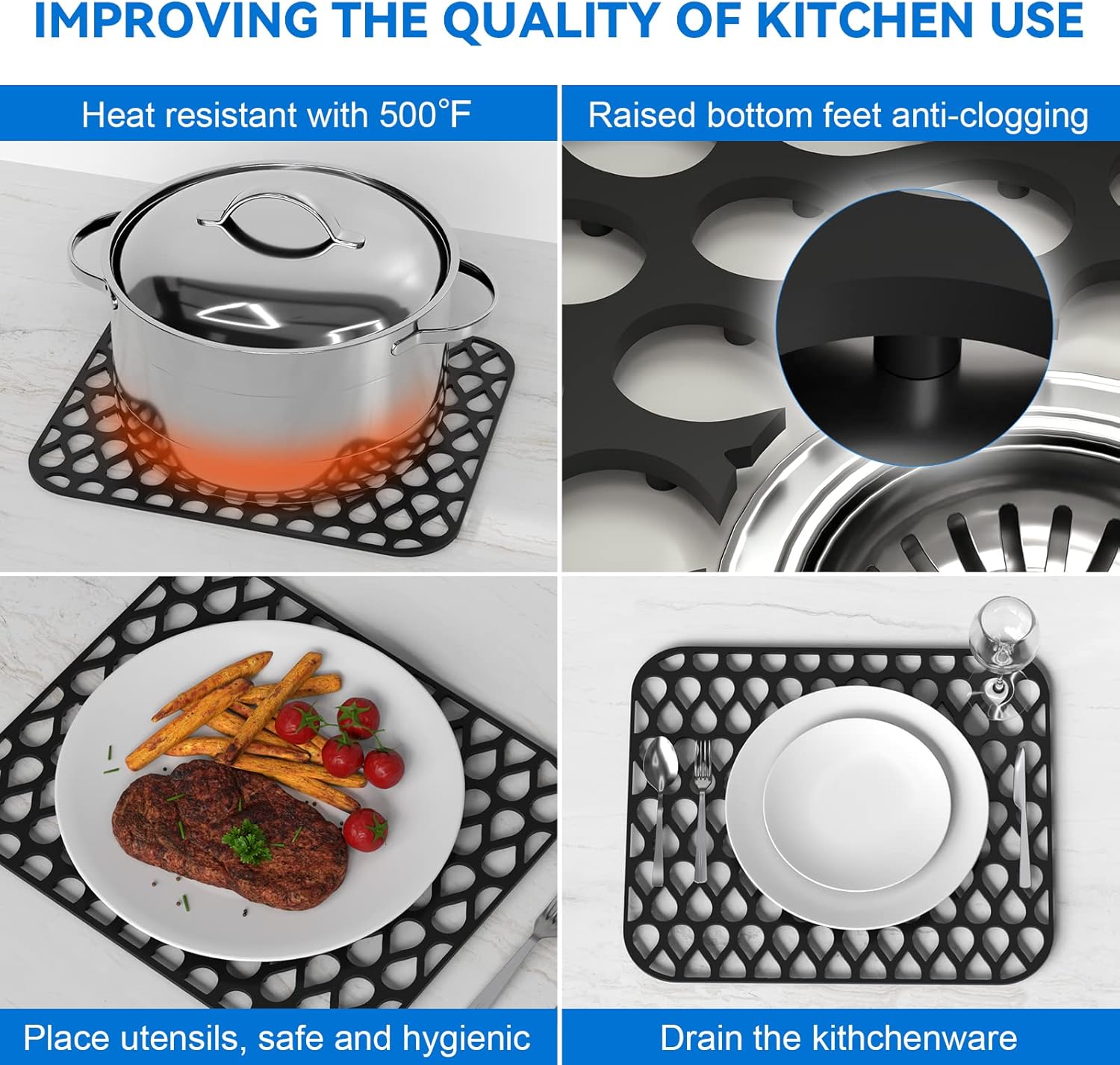 - Safe and High-Quality Material - TOOVEM kitchen sink protector is 100% food grade silicone, non-toxic, and heat-resistant silicone sink mat. In particular, it is a perfect choice for kitchen drying mats, dish draining racks, draining racks, cooling racks, and defrosting grids.