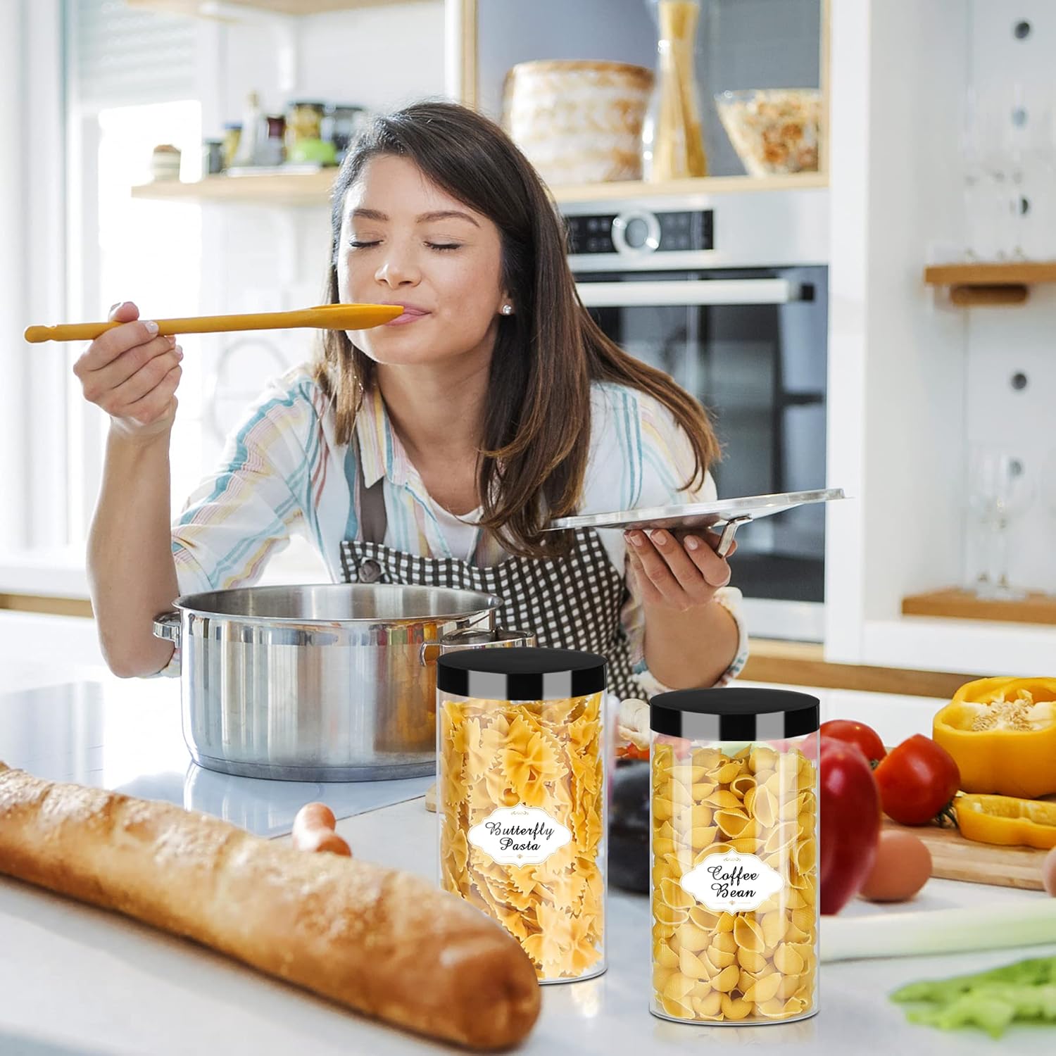 - Package & Tips: 32 oz plastic jars totally 16 pcs plastic containers with black lids, you will get 24 pcs stickers for the plastic jars with lids and 1pc pen. These clear plastic jars kit meet all your different uses. WARM TIPS: DON’T put the clear round jars in dishwasher. DON’T use these plastic round jars for holding hot items. DON’T put the jars in the microwave to avoid melting. Please wash the plastic jars with lids with warm water before first use
