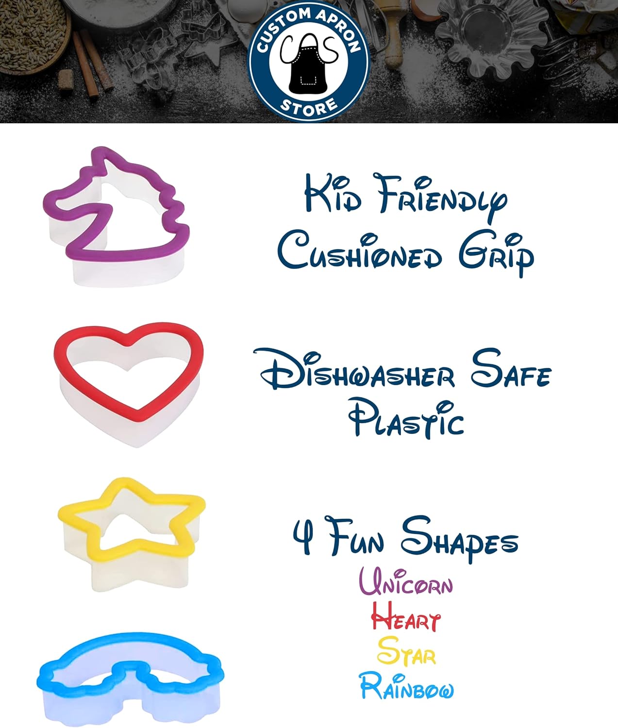 • Included: Personalized Kids Chef Apron and 4 Colorful Cookie Cutters in Fun Shapes that Kids Love (Unicorn Cookie Cutter, Heart Cookie Cutter, Rainbow Cookie Cutter, Star Cookie Cutter)