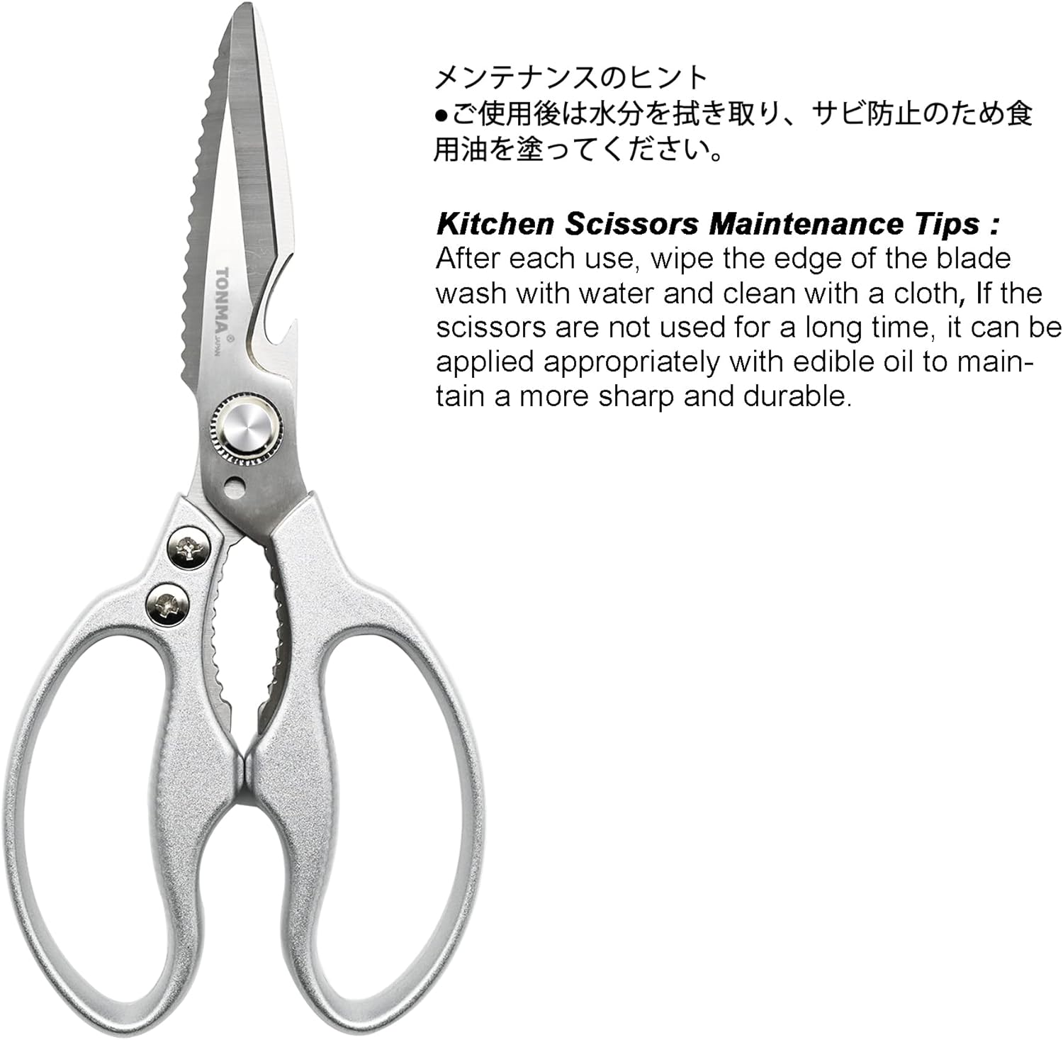 - [ RESTAURANT GRADE KITCHEN SHEARS ] - The blades of kitchen shears heavy duty powerful are made of high-strength Japanese SK4 heavy duty stainless steel (4mm blades thickness, HRC: 60±1), the TONMA multipurpose kitchen scissors all-purpose have heavy-duty built quality lasts a lifetime, great as herb scissors, cooking food scissors, utility scissors, craft scissors, tailor fabric scissors.