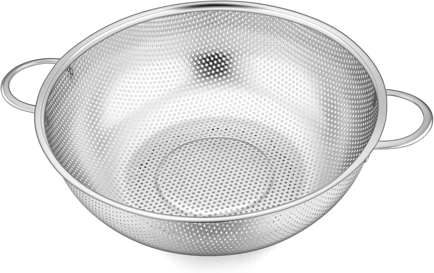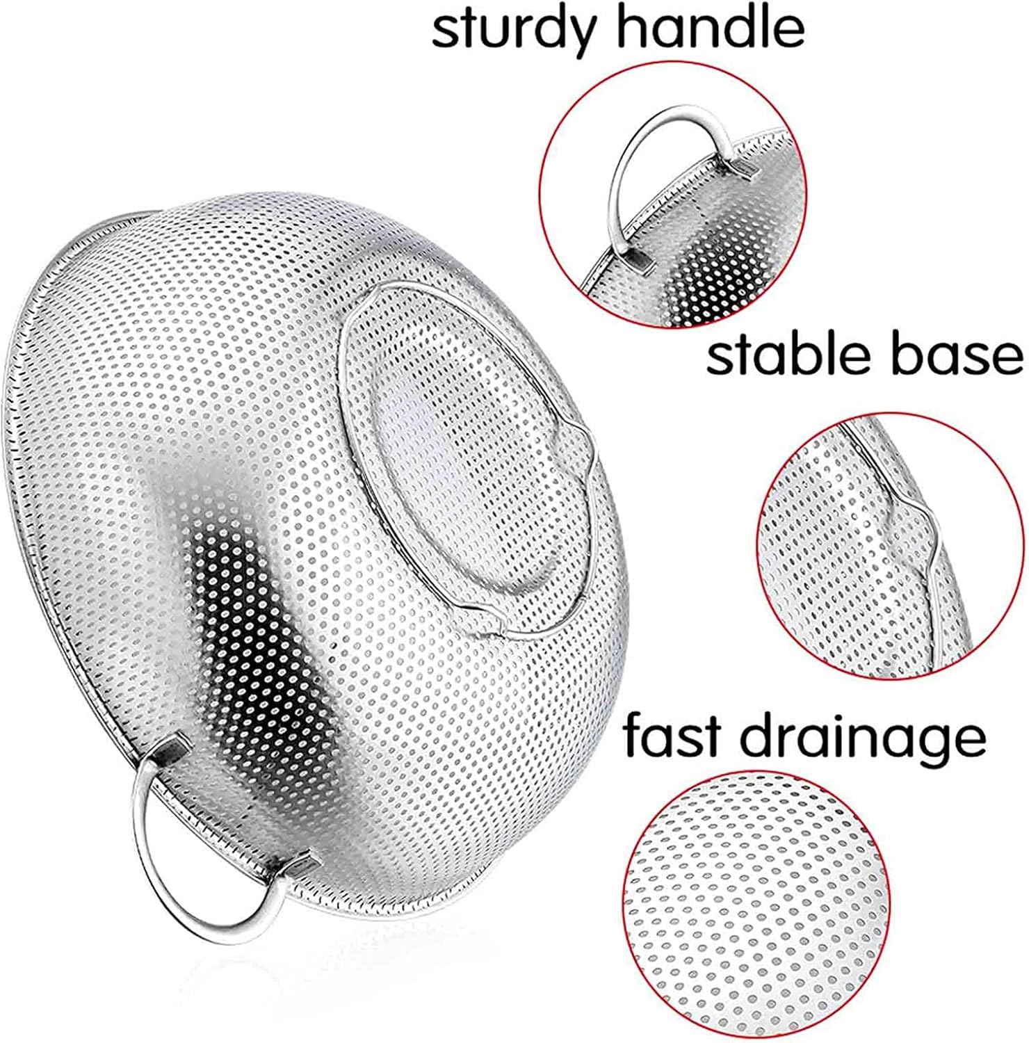 - QUICK DRAINING β Closely spaced holes on the whole surface for draining water faster and without tilting the metal strainer to avoid the food flowing out, Tiny holes for no worry about small foods(nuts, spaghetti, noodles) slipping through
