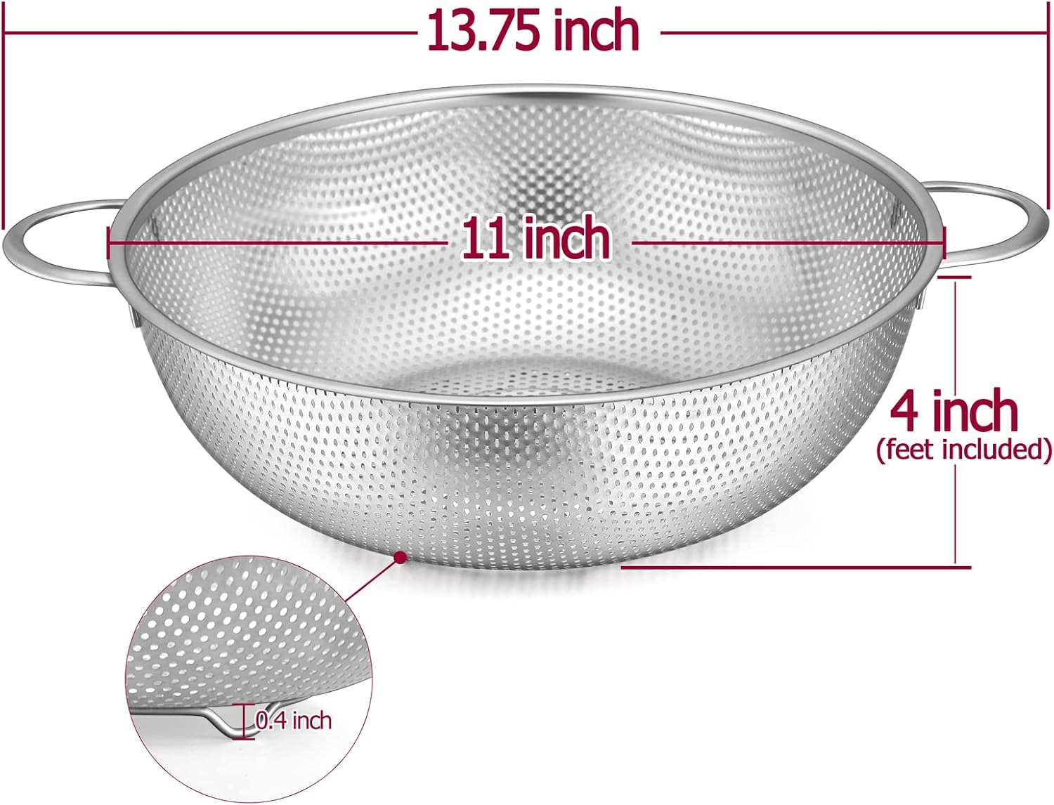 - STABLE FEET β 3 raised feet help the food strainer stand stably on the flat surface and no worry about tipping, 0.4 inch height helps drain all water away from your spaghetti or veggies but wonβt touch to the sink