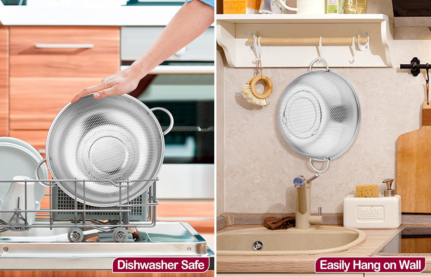 - STURDY HANDLES β 2 solid handles are welded firmly for balanced and comfortable grip, No worry about coming off, Easy to hang on the kitchen hook to save space, Smooth edge and surface without any sharp spurs to prevent hurting