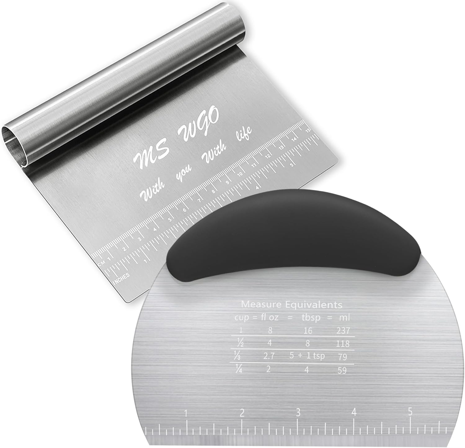 - Bench Scraper and Dough Cutter Set - Our pastry cutter and Pizza Cutter are made of well-made stainless steel pizza cutter kitchenware. You can use Dough Scraper to cut cakes, dry dough, pizza, green pepper, cucumber and other foods. Set of 2 Pack are your good partners in making vegetable salad.