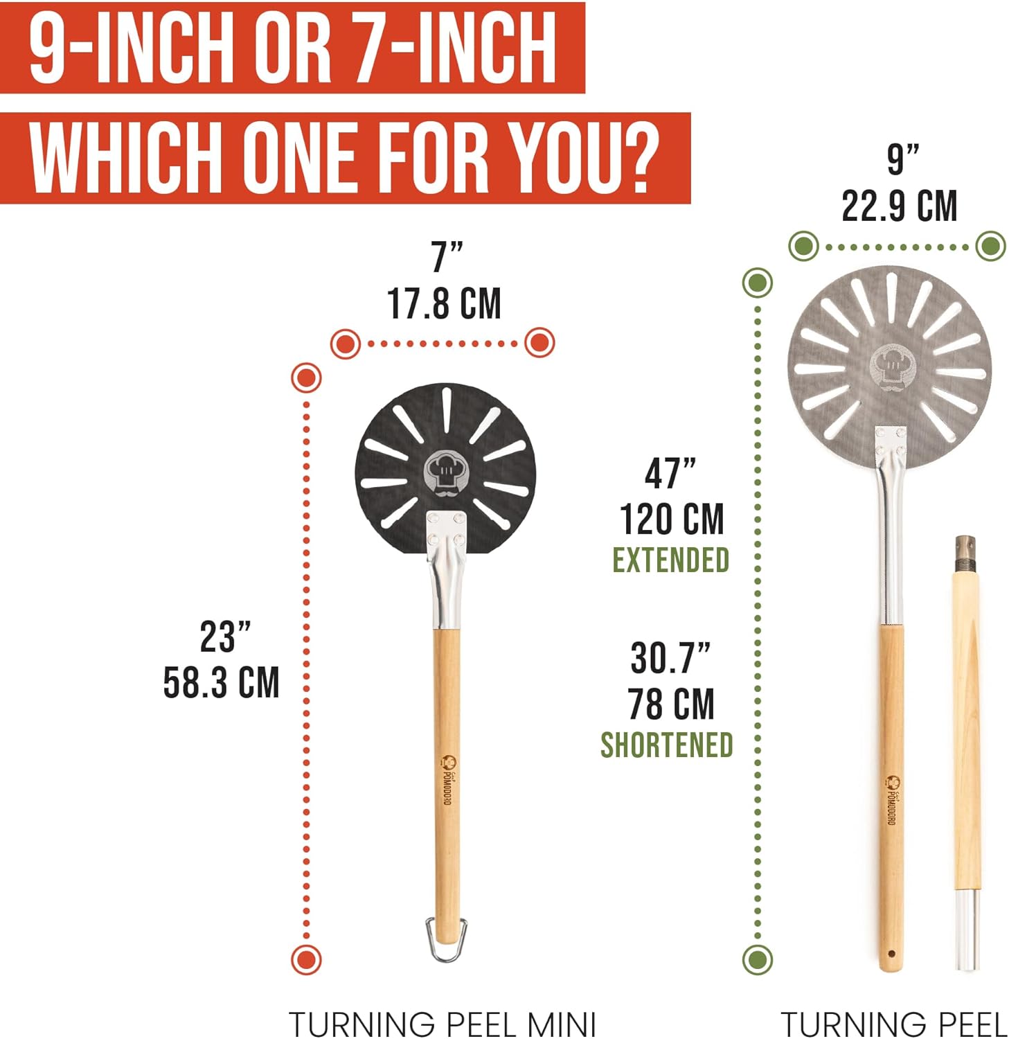 - EASY HANDLING: Chef Pomodoro’s 7” Aluminum Turning Peel is designed for easy maneuvering and rotating your pizza in a scorching hot oven. Featuring a hard anodized aluminum head and wooden handle, the peel can handle both home pizza ovens and commercial sized ovens. Get the peel designed by and for professionals.