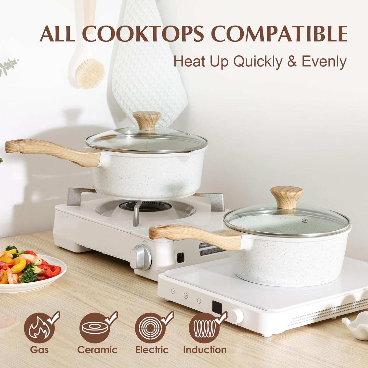 SENSARTE White Ceramic Nonstick Saucepan with Lid 1.5 Quarts, Small Cooking Pot with Stay Cool Handle, Induction Compatible Saucepot, White Granite Coating, Free of Intentionally Added PTFE/PFOA/PFAS