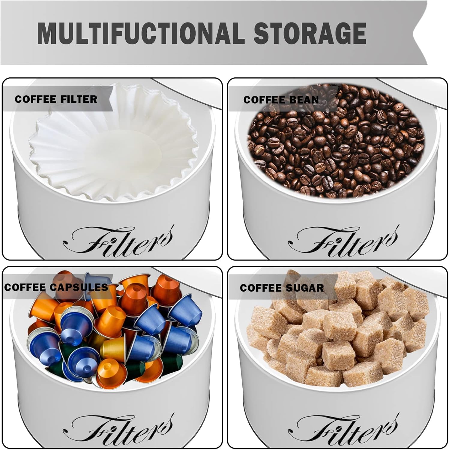 - 【MULTI-USE COFFEE FILTER STORAGE】Our round coffee filter storage is a great container to hide the ugly coffee filter, and also a multi-purpose basket container to hold coffee pods, K cups, tea bags, utensils and more. This Coffee filter case is perfect as a lovely housewarming gift for family, friends and so on.