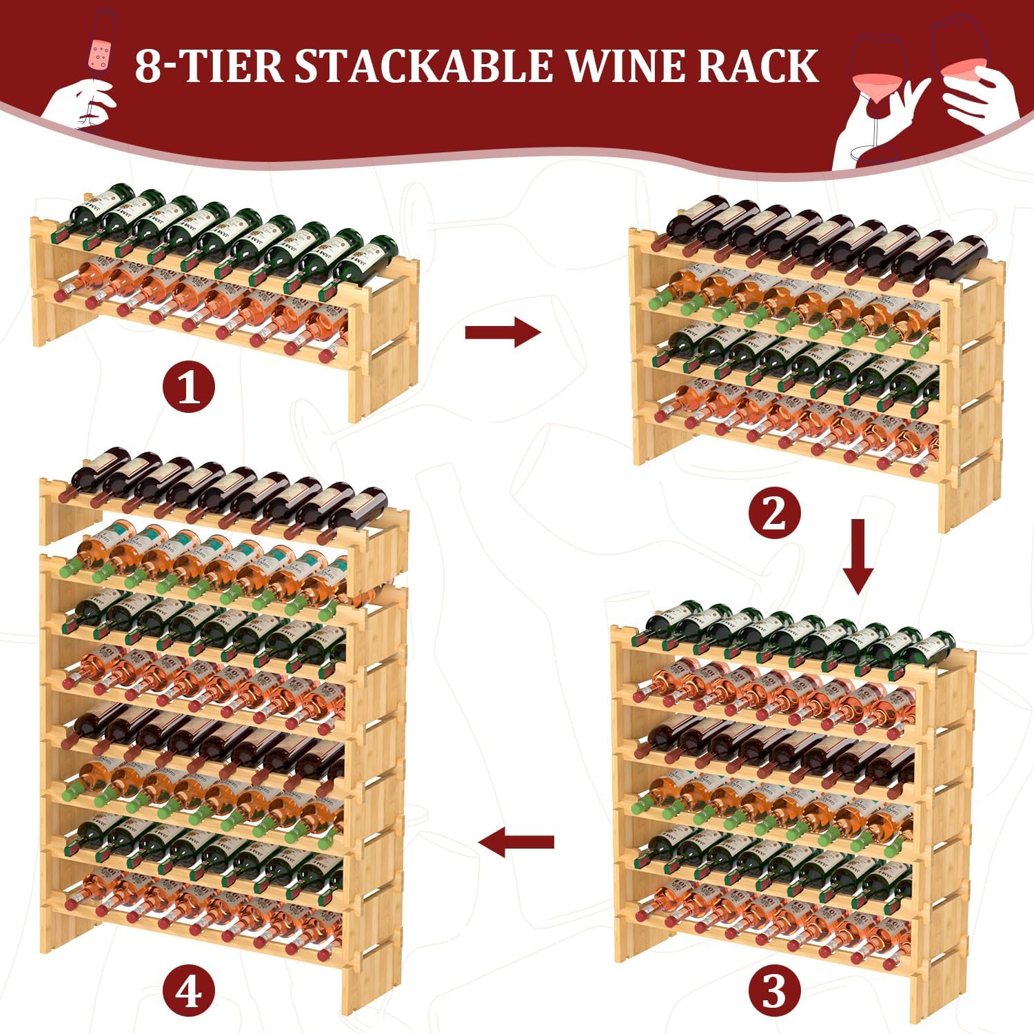 - STACKABLE WINE RACK: Each bamboo board has deep grooves and is tightly fastened to each other without loosening. The 8-tier compact design saves a lot of space and holds enough wine. You can choose single layer or stacked use.
