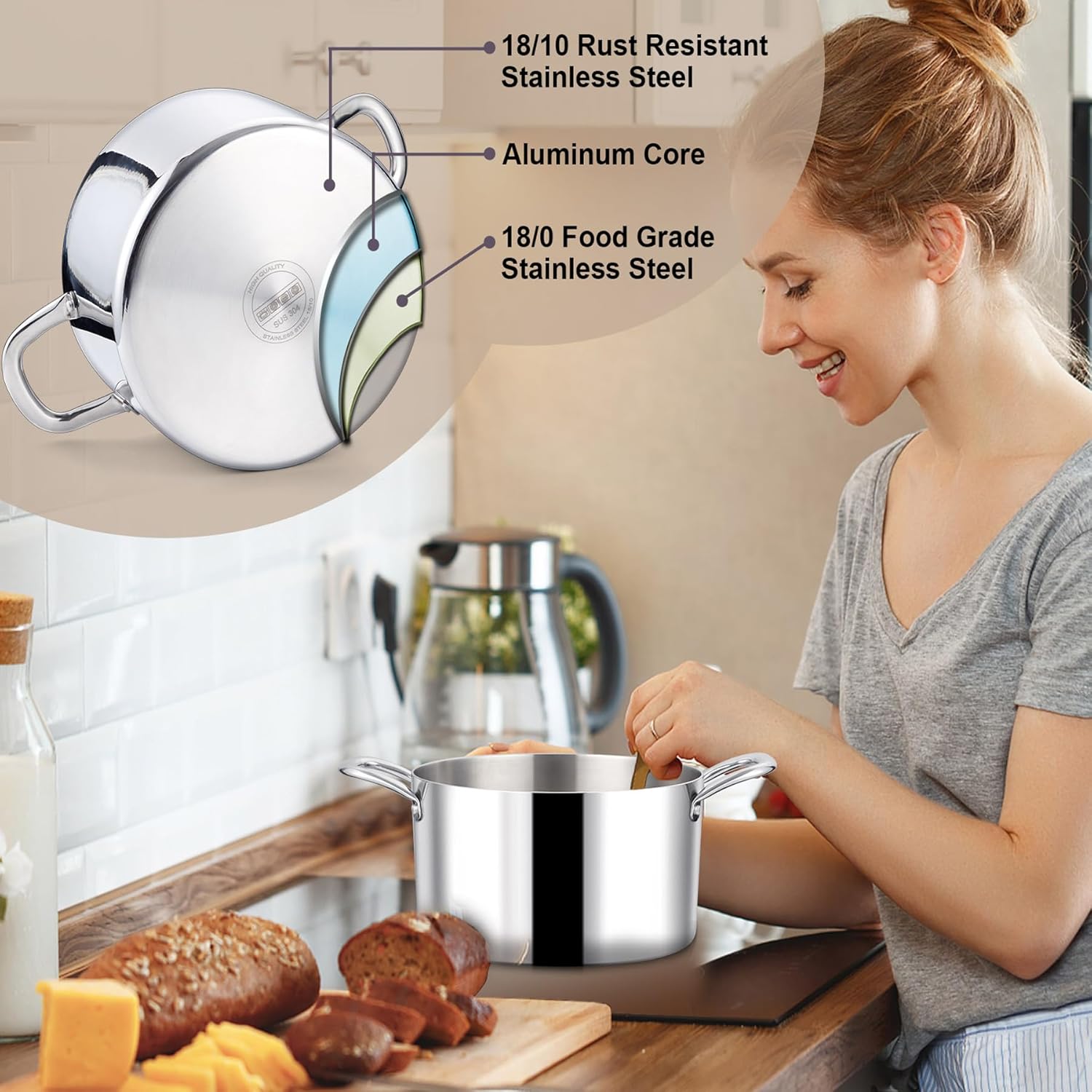- Premium& Healthy Material, 6 quart soup stock pot is made of high quality food grade stainless steel, it can’t chemically react to any food at high temperatures, which is non-toxic, non-allergic & safe for cooking, large pasta pot with 3 layers structure including 2 layers stainless steel and 1 layer aluminum core(others just use 1 layer metal), our pot is anti-rust and warp resistant, lot more durable and sturdier