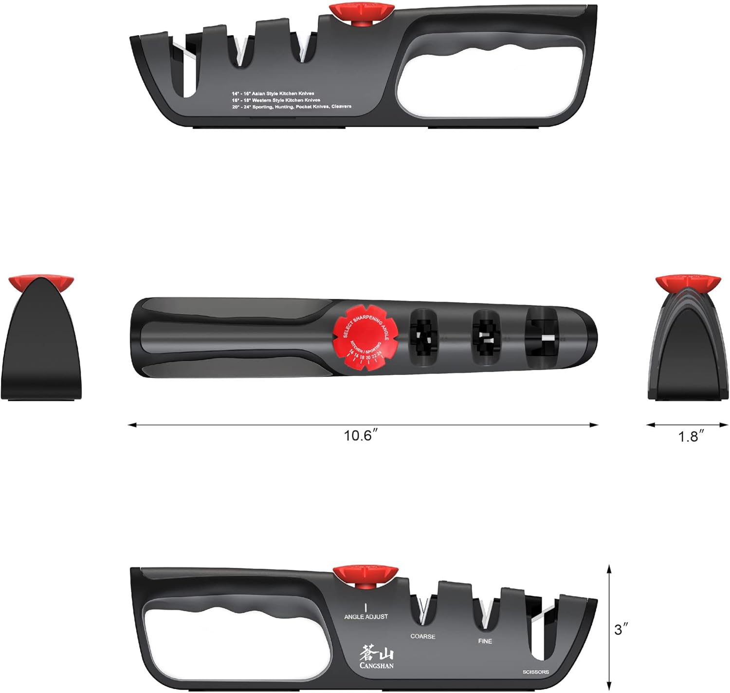 - Knife Block Set Includes: 8in Chef’s Knife, 7in Santoku Knife, 8in Bread Knife, 9in Carving Knife, 9in Forged Shears, 5in Serrated Utility Knife, 3.5in Paring Knife, 2.75in Peeling Knife, Adjustable Knife Sharpener, Solid Acacia Wood Block