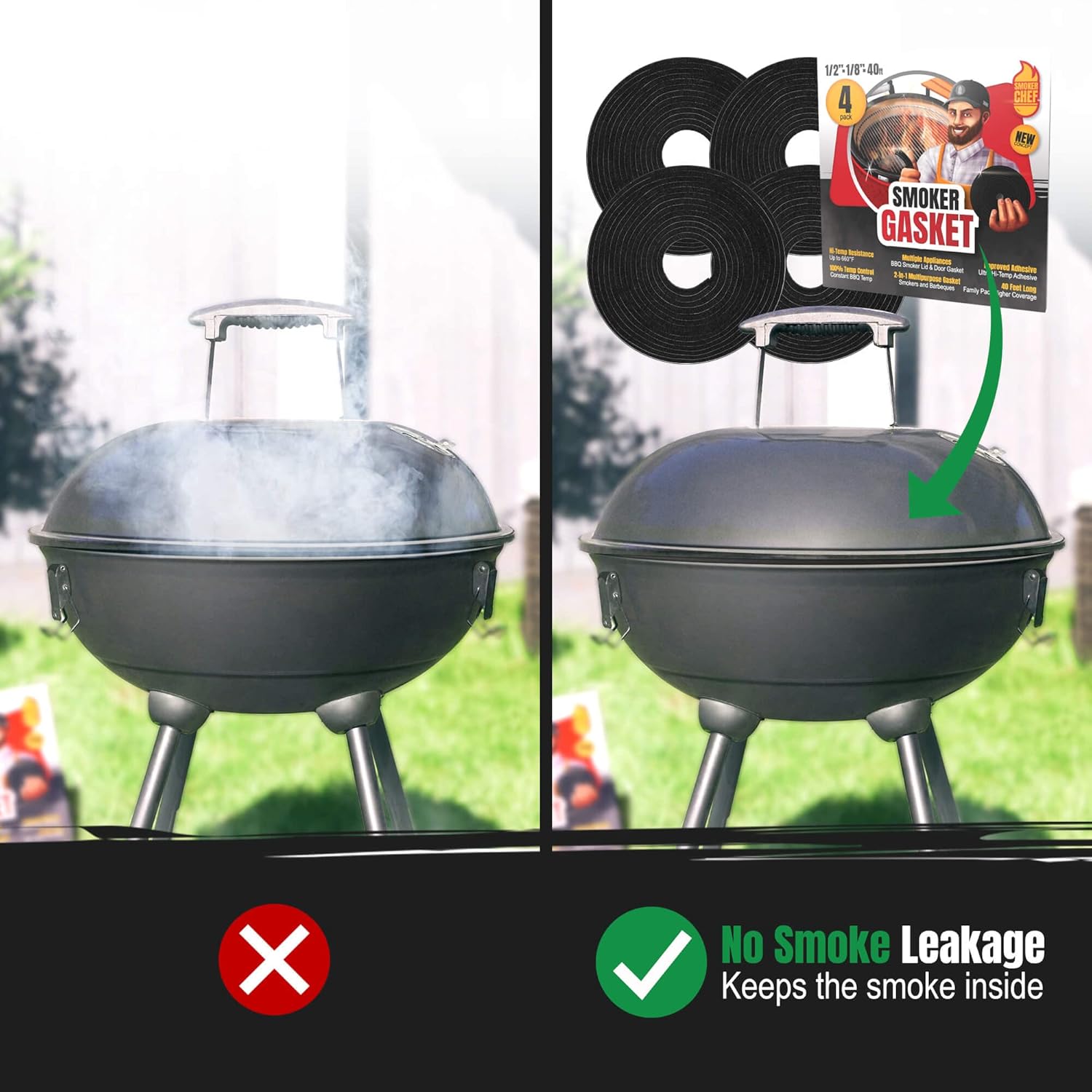 - ✔️[ HIGH PERFORMANCE GASKET ] Get your Smoker Chef HI Temp BBQ Gasket right now and boost the performance of your grill / smoker. Our fire tape for grill is made out of premium fireproof (fire resistant) high temp gasket material, designed to endure a high temperature, up to 660F. Due to the high-quality adhesive tape, the gasket will instantly stick to the grill and its lid ensuring a long-term strong seal. It prevents any smoke leakage and will maintain a constant temperature inside the grill.
