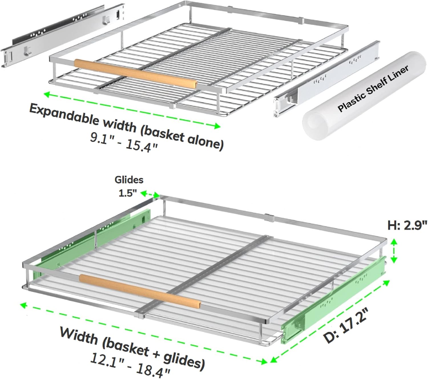 - EXPANDABLE DESIGN: This pull out cabitnet shelf is designed to fit in most cabinets. The width of the wire basket can be adjusted from 12.3“ to 18.5”. The new expandable design gives you a better experience and saves your space