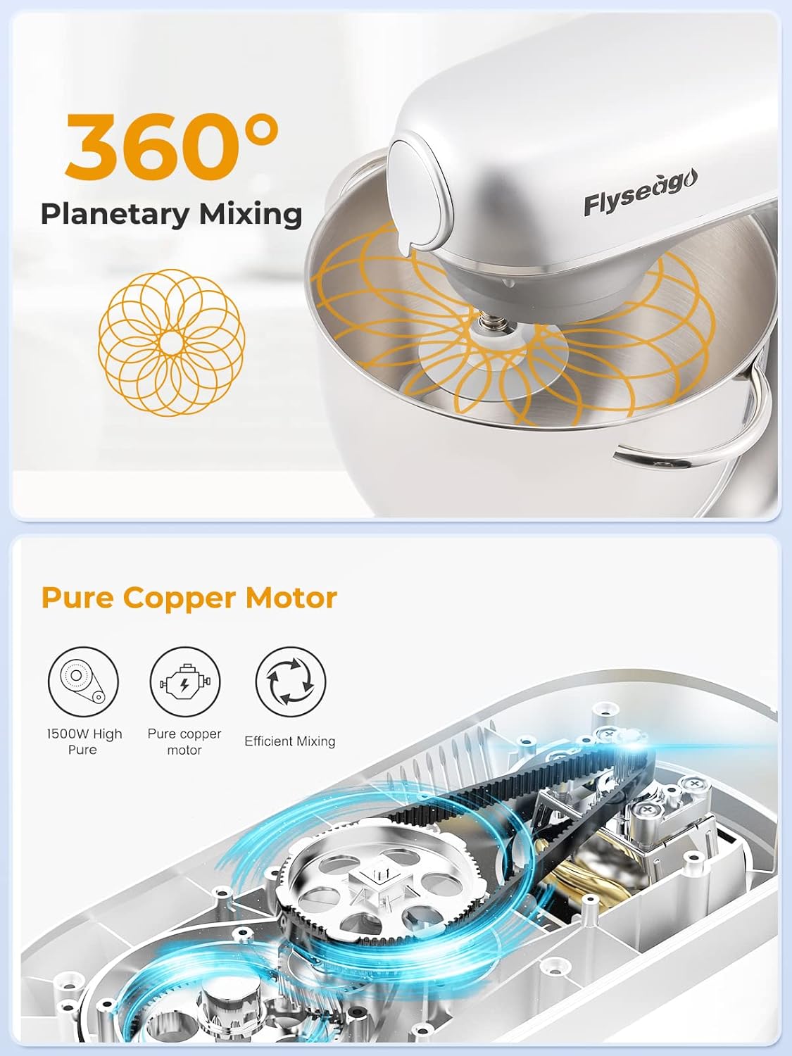 - 6+F Speed and Planetary Mixing: The multifunctional electric mixer has a 660W pure copper motor, so you choose from 6 speeds and F (fermentation function), whether it's slow stir or a fast mix. It can also ferment dough, which is perfect for different recipes. The planetary mixing system ensures thorough and uniform mixing so to make food taste better