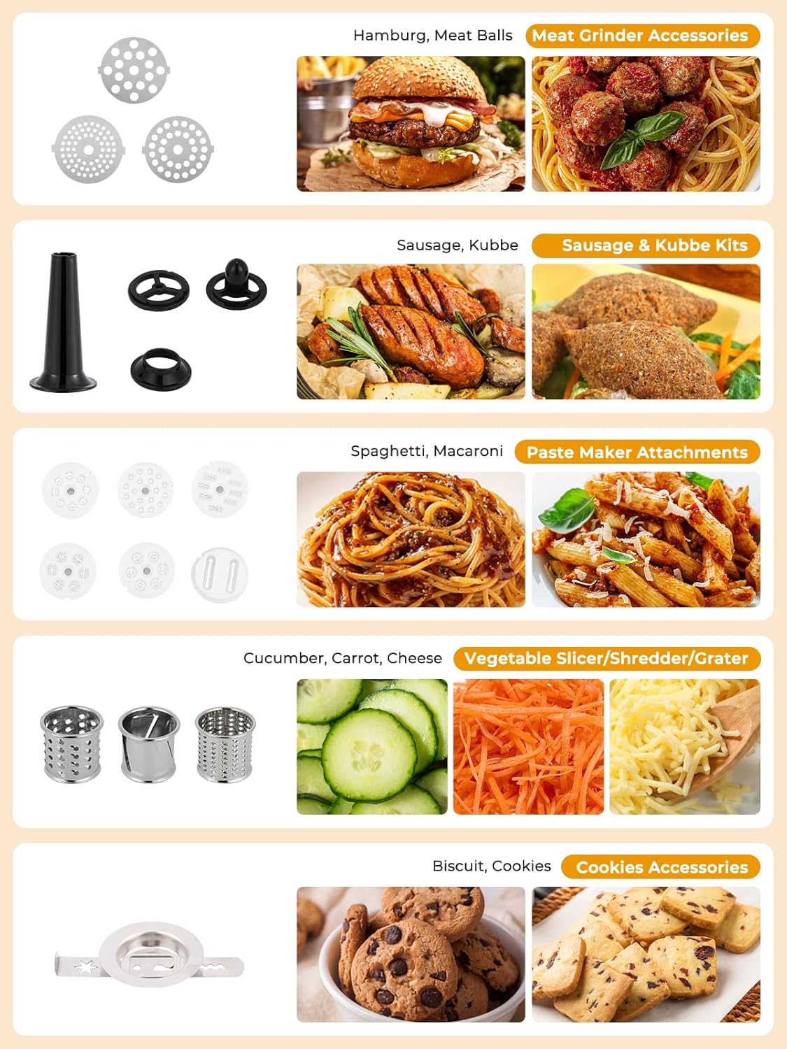 - 8-IN-1 Multifunctional Stand Mixer: 8.5 quarts of high capacity stainless steel mixing bowl can contain 30 egg whites. Equiped with meat grinder, 1.5L juice cup and various accessories like cookie, sausage, noodle, you could mix bread dough, thick batter, whipped cream, and make cookies, sausages, meat balls or juice