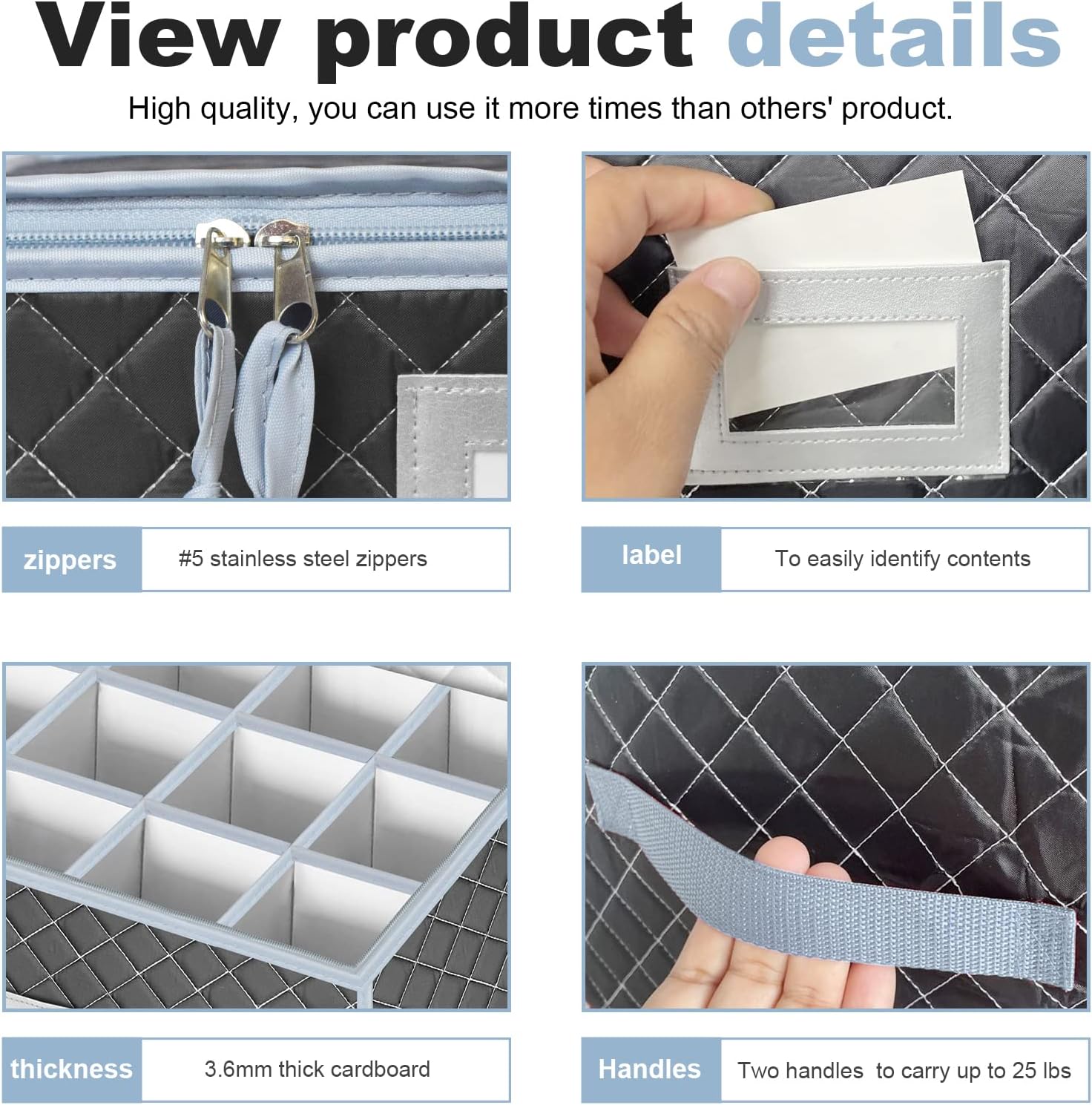 - 👍【Quality Material】: Both the stemware and mug storage bins with 2 sturdy handles.They are hard shell constructed by thick hard cardboard covered with quilted oxford cloth, each with 12 compartments to keep your glasses/cups from bumping into each other. For 4 dish storage containers, we provide 12 free felt separators, in total 48 sheets for you to put between plates to prevent scratches. Please rest assured that they will provide the best protection for your fine/delicate and fragile dishes.