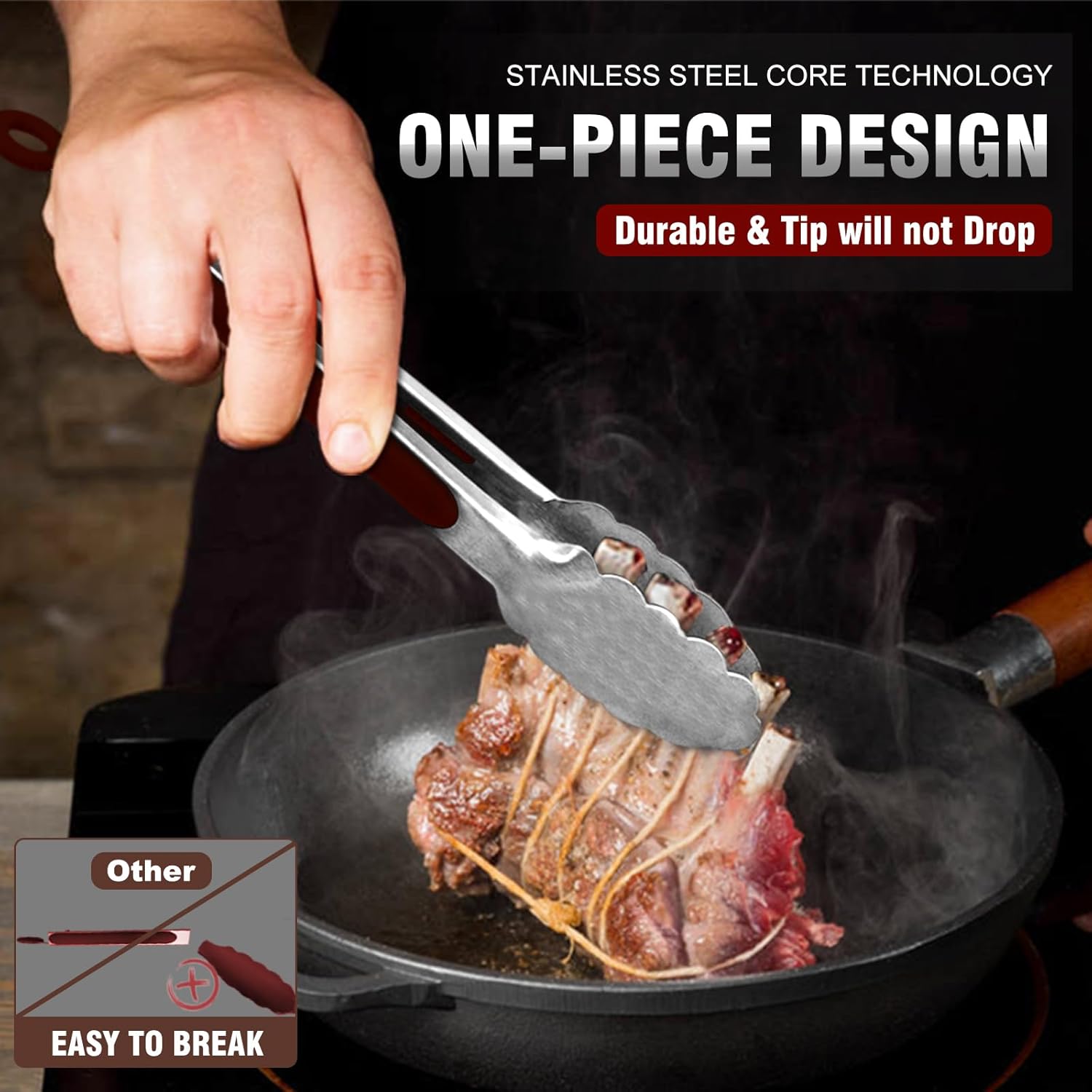 - ★ERGONOMIC HANDLE DESIGN AND HEAT RESISTANT-The handle is cushioned with non-slip silicone,great for thumb rest,and ensures handle grip and control.The metal tong head is super heat resistant.Easy to rinse, dishwasher safe and easy to clean.