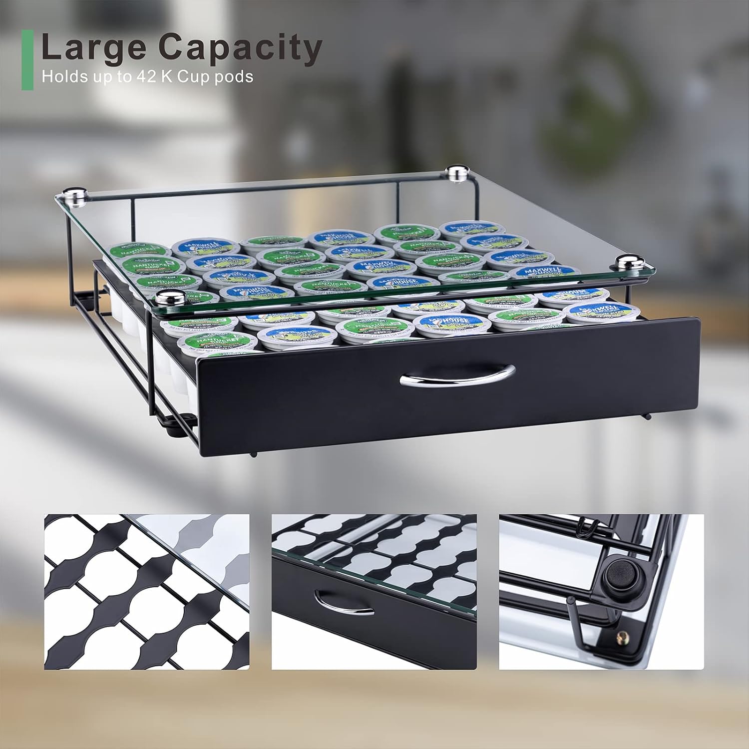 Rice rat Coffee Pod Holder for Keurig Pods Glass Top Drawer,K cup Holder Capsule Display Storage compatibility 42 k-cup(Black)