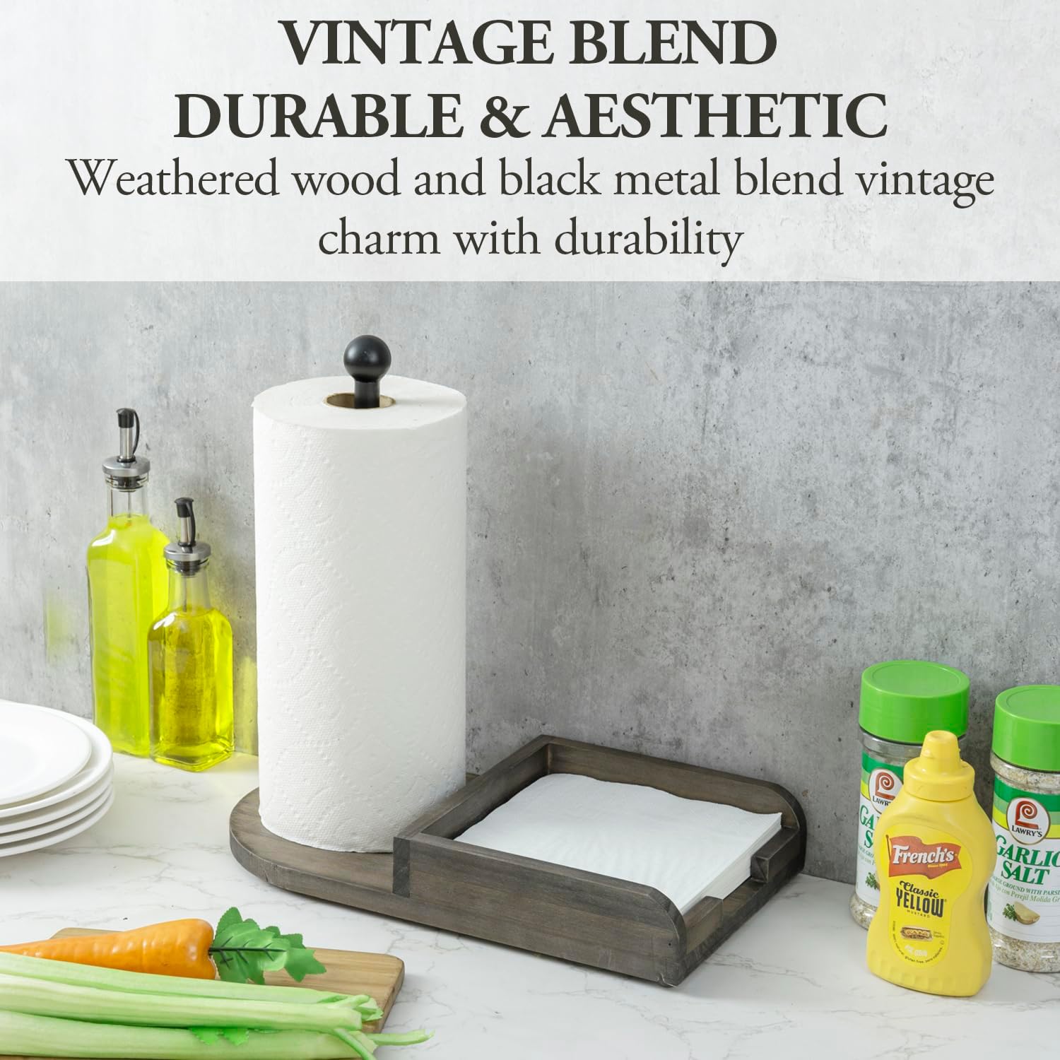 MyGift Vintage Weathered Gray Solid Wood and Black Metal Paper Towel Roll Holder and Napkin Dispenser Combination Storage Rack for Kitchen Counter or Dining Table