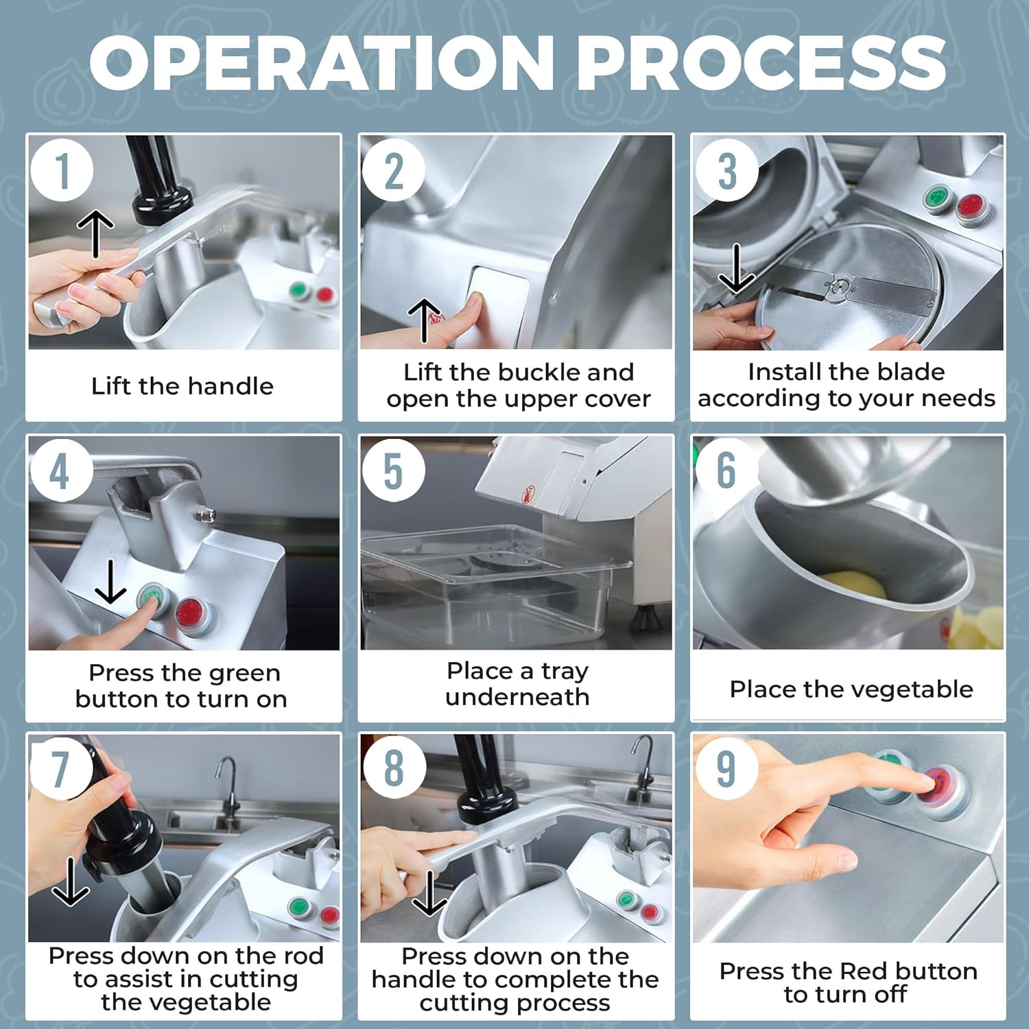 - Compact & Lightweight But Packed With Power: The multipurpose vegetable slicer measures 16” x 12” x 27” and weighs just 35 pounds, so it's perfect for commercial kitchens of all sizes; This commercial food processor packs a punch, though; It's equipped with a noiseless 1 HP / 1500 RPM copper-core motor and 2x feeding tubes (large and small)