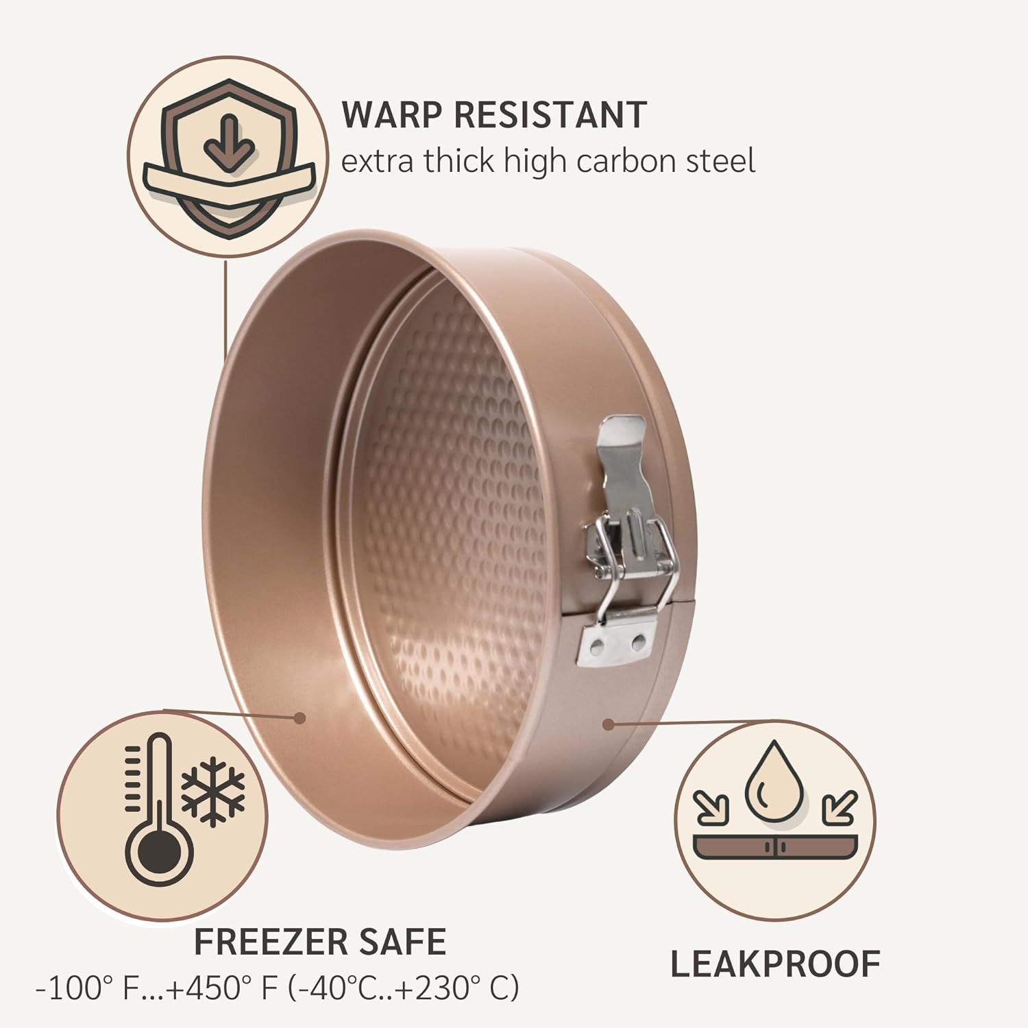 - π― SUPERIOR HEAT CONDUCTION thanks to high carbon steel - this spring cake pan heats evenly & eliminates hot spots avoiding burnt or undercooked cakes. The extra thickness helps promote perfectly uniform baking and is designed for long lasting use and built to stand up to daily wear and tear.
