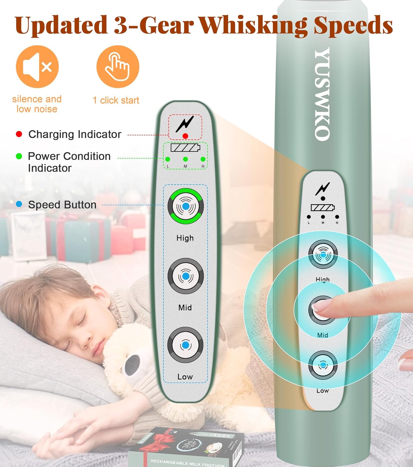 YUSWKO Milk Frother Handheld for Coffee, Rechargeable Drink Mixer with 3 Heads 3 Speeds Electric Coffee Frother Whisk, Gift for Many Occasions and Festival