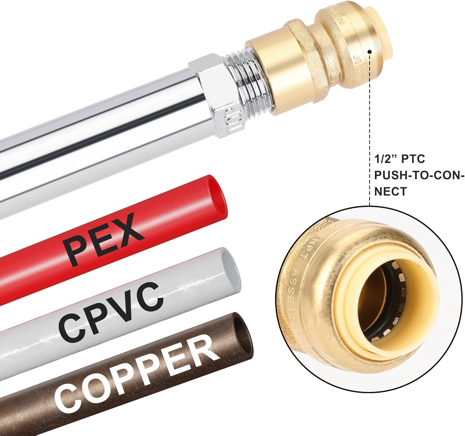 - Has an integrated 1/2 in. push-to-connect inlet that is compatible with PEX, copper, CPVC, PE-RT and SDR-9 HDPE pipes and a 3/4 in. garden hose outlet.