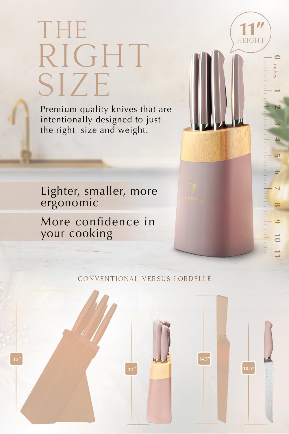 - Stunning Design Meets Comfort & Function: Discover the perfect blend of style and utility with Lordelle's "Right Size" concept. Smaller, ergonomically designed knives and a compact block that enhance both your cooking and kitchen décor, without taking up too much space.