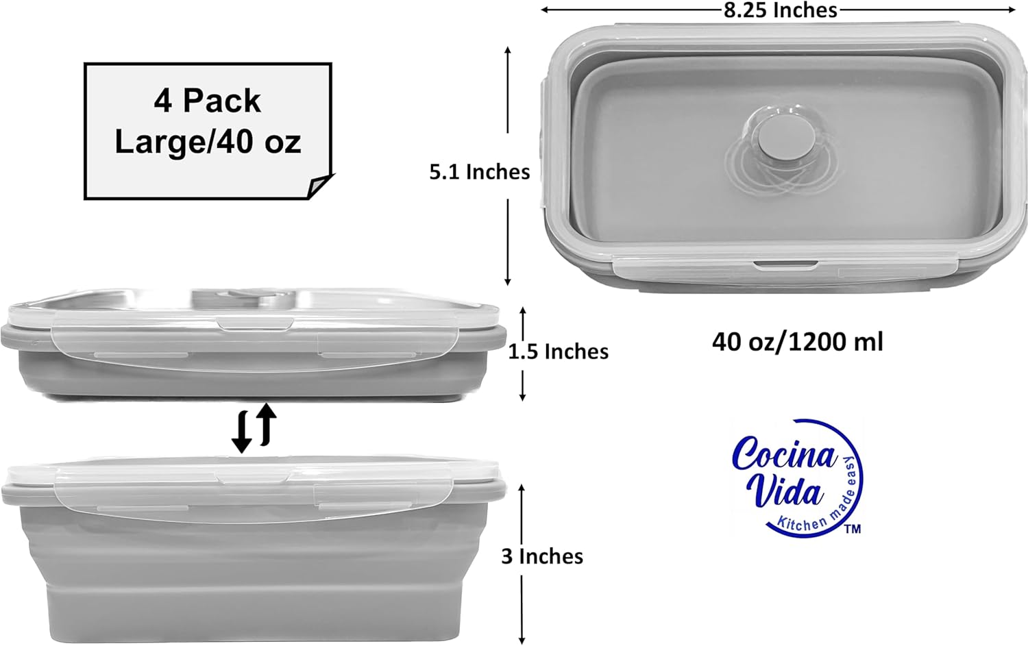 - Each of our silicone food storage containers with lids can accommodate up to 40 ounces / 1200 ml, providing ample room for packing your lunch and ensuring portability. The dimensions of our silicone storage container are 8.25 x 5.1 x 3 inches (which reduce to only 1.5 inches when collapsed).