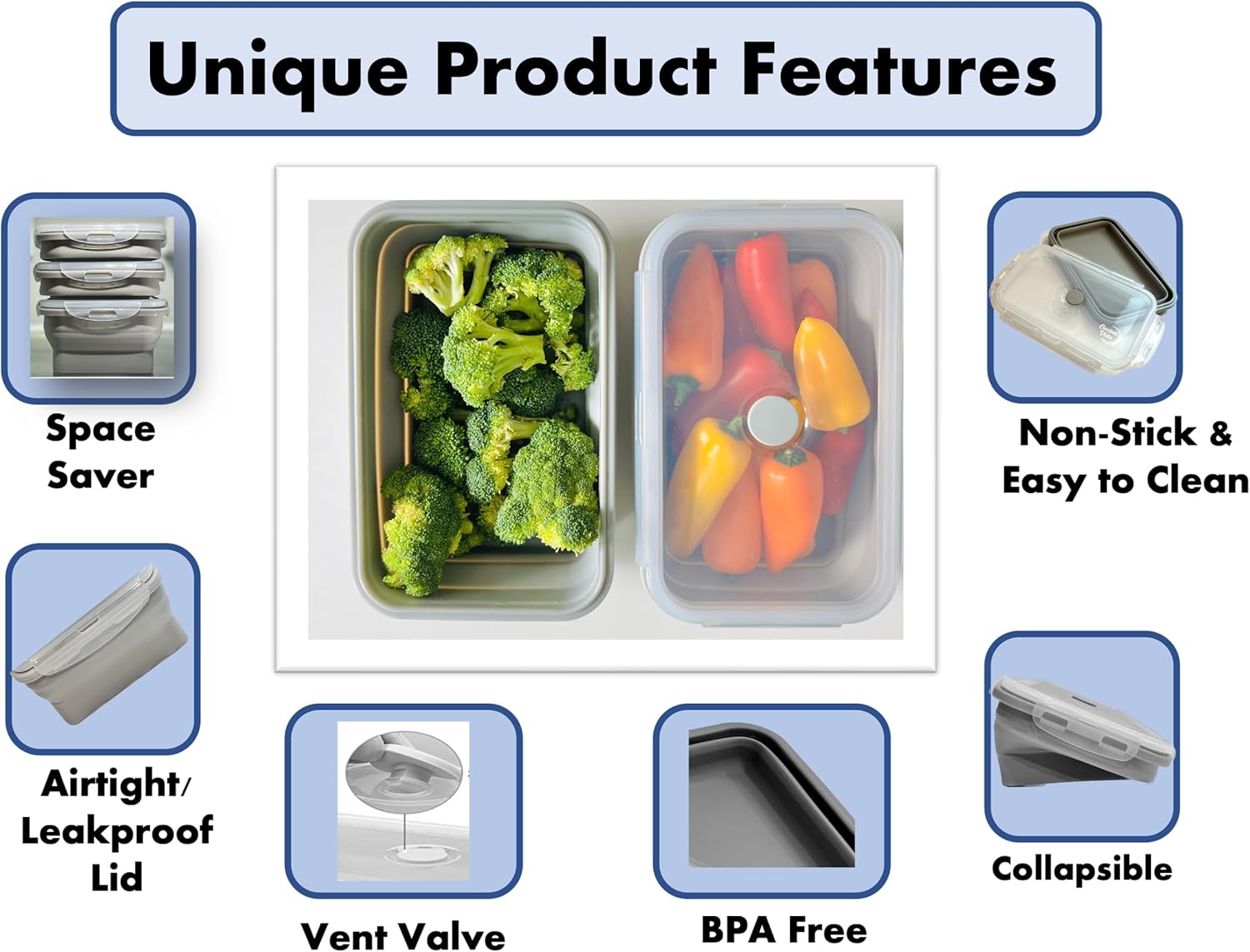 - Our food storage containers come with airtight lids featuring a robust snap-lock mechanism on all four sides, ensuring a secure and leak-proof seal. With the vent valve in the upright position, these silicone food storage containers are microwave-safe.