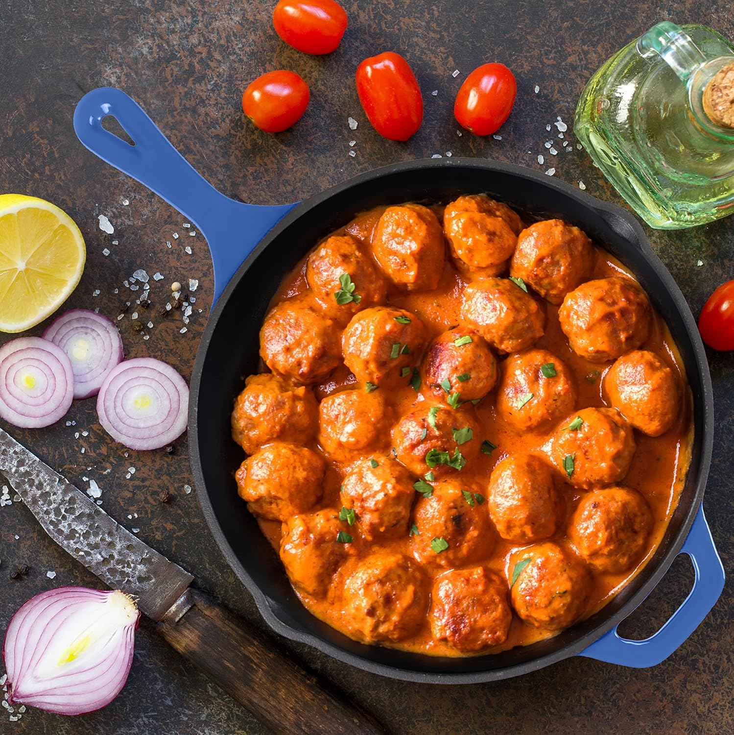 Utopia Kitchen Saute Frying Pan 12 Inch, Cast Iron Chefs Pan, Pre Seasoned Cast iron Skillet With Lid, Safe Grill Cookware for Indoor & Outdoor Use, Blue