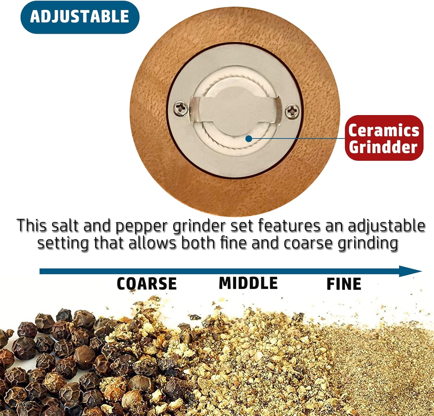 - 4、NATURAL WOOD MATERIAL - This manual salt and pepper grinder set is made of natural oak wood, stainless steel and ceramic grinding mechanism,Environmental protection Acrylic materia,non-corrosive, you can use safely.This natural wooden salt and pepper mill is a elegant and fancy decoration in kitchen.