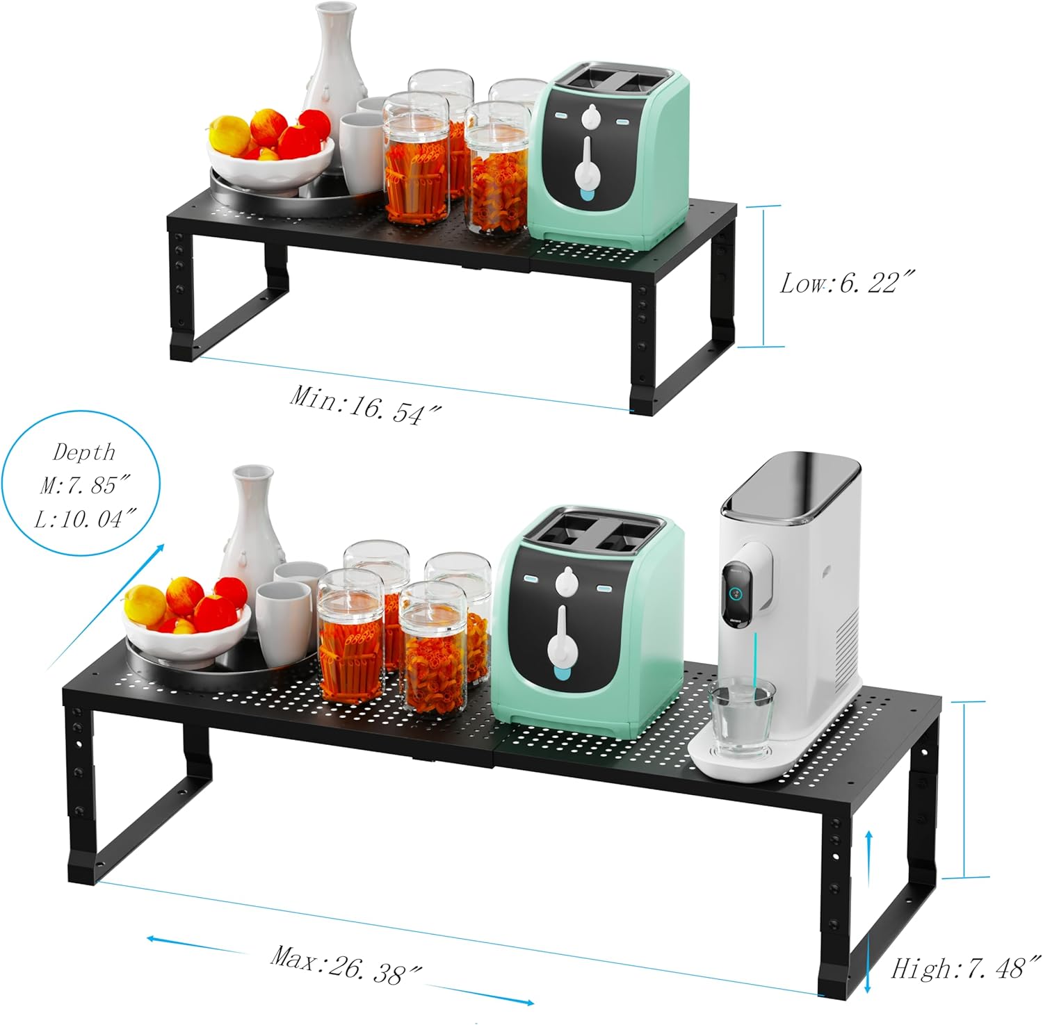 - ⭐[Expandable & Stackable independent Cabinet Organizer]The Cabinet shelf length is flexible, it can be extended from 16.54~26.38" depending on how you want to organize your space (16.54"~26.38"L x 7.85/10.04"W x 6.22~7.48"H).You can use it alone, or multiple shelves stacked together to store your goods. To improve the storage space of the cabinet and max the storage efficiency.