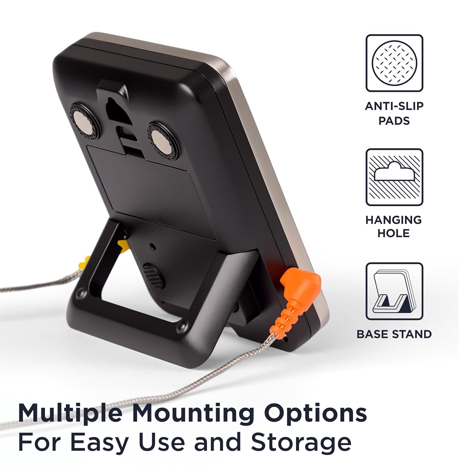 - Dual Probe for Maximum Versatility – Cook two dishes at once or track internal meat temps and ambient oven or smoker temps simultaneously. The 6-inch probes and 40-inch stainless steel mesh cable connect the instant read thermometer to the base, allowing you to use it as an oven thermometer for electric oven temperature or a smart meat thermometer for grilling and smoking.