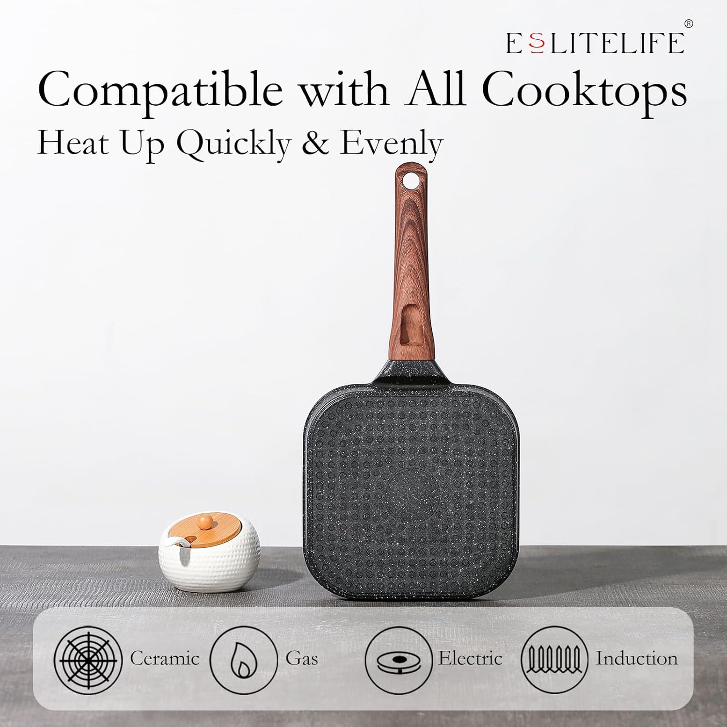 ESLITE LIFE 7 Inch Nonstick Small Grill Pan for Indoor Cooking, Versatile Induction Square Grilling Skillet Steak Pan for Stove Tops, PTFE & PFOA Free, Black