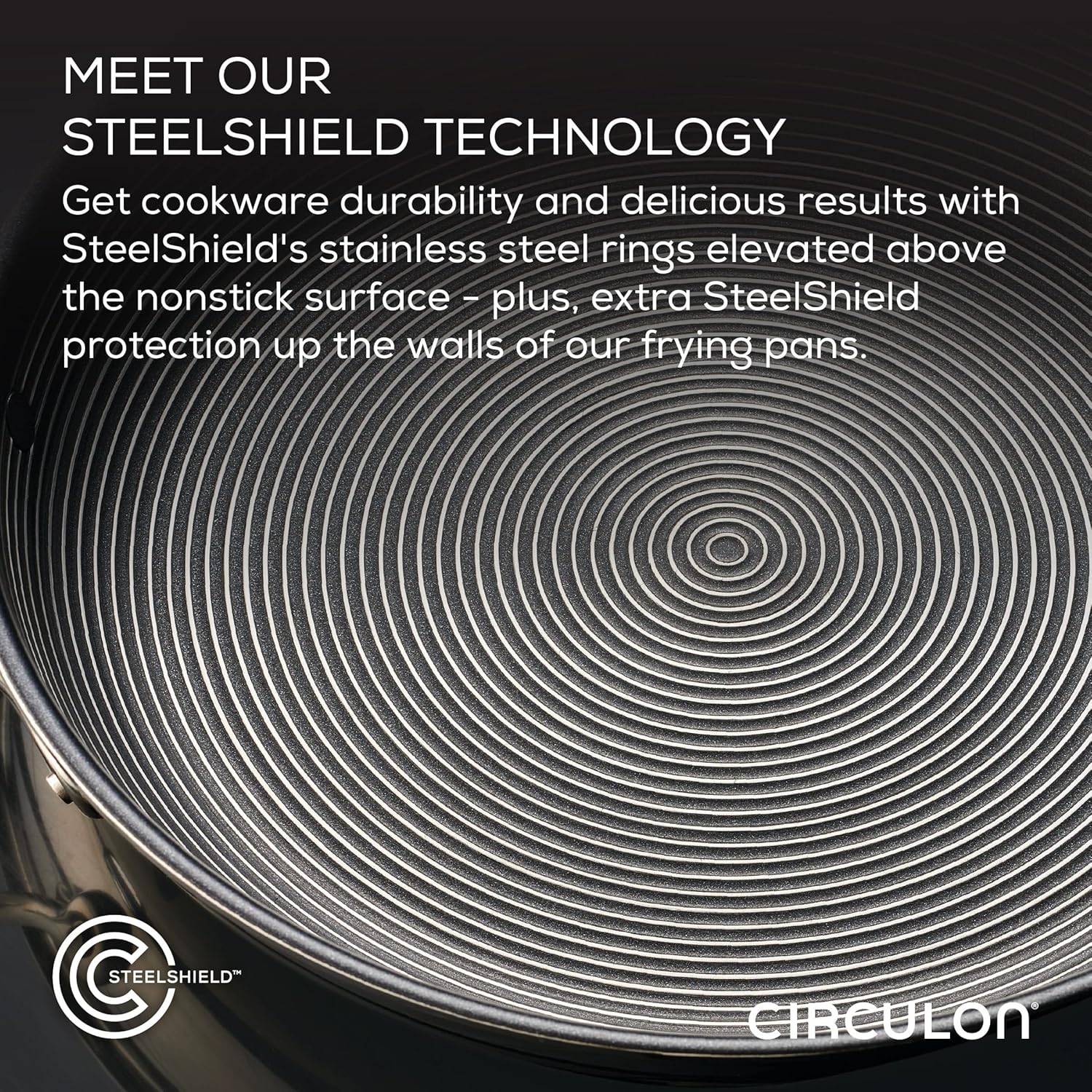 - WHAT IS STEELSHIELD: Circulon SteelShield pots and pans are the first to feature stainless steel circles raised above a premium nonstick finish for the most versatile and durable cookware surface yet. Use any kitchen spoon or spatula on hand to flip, fry, and even scrape the innovative SteelShield rings. On our frying pans, the rings extend up the side walls for even more surface protection. Metal utensils? Bring it on.
