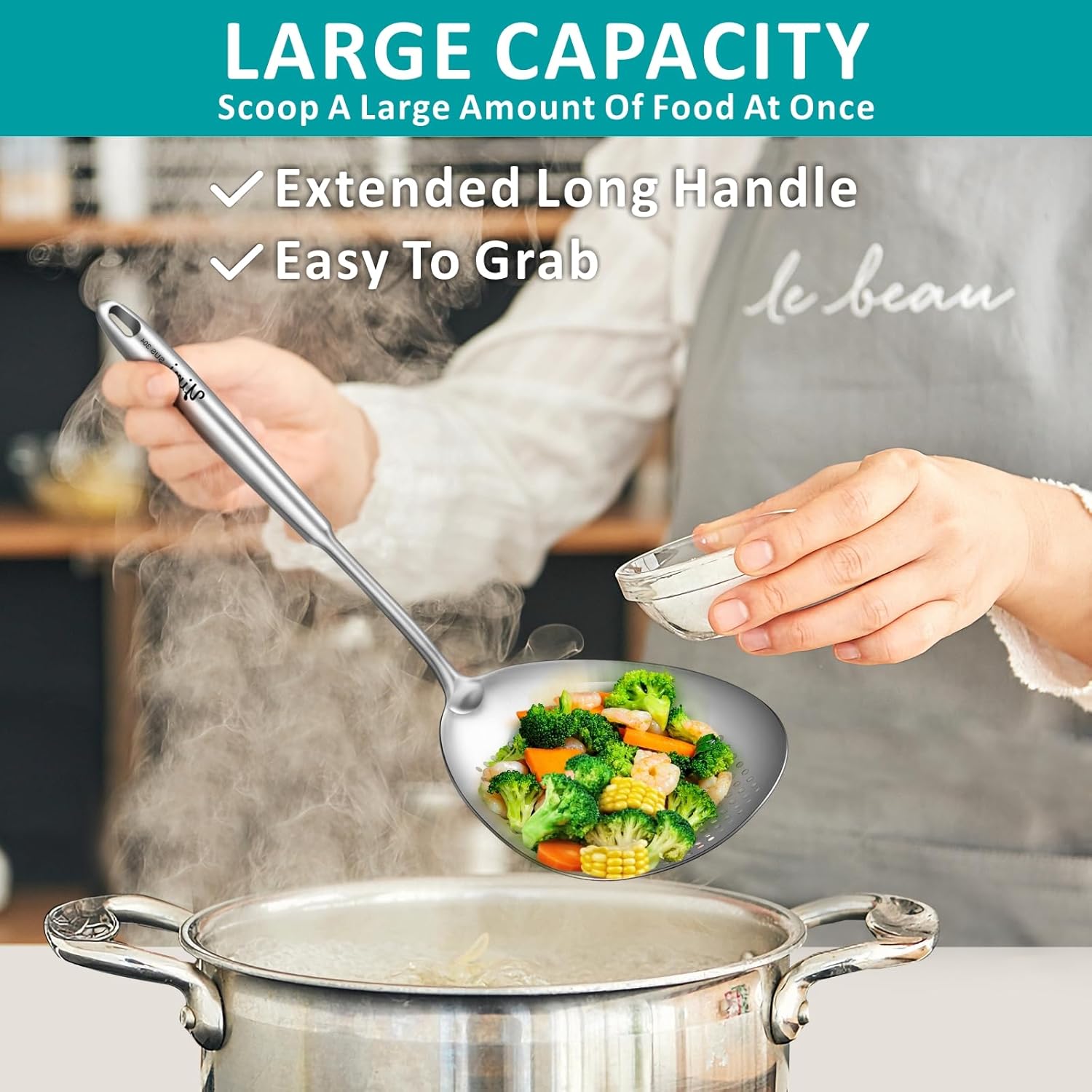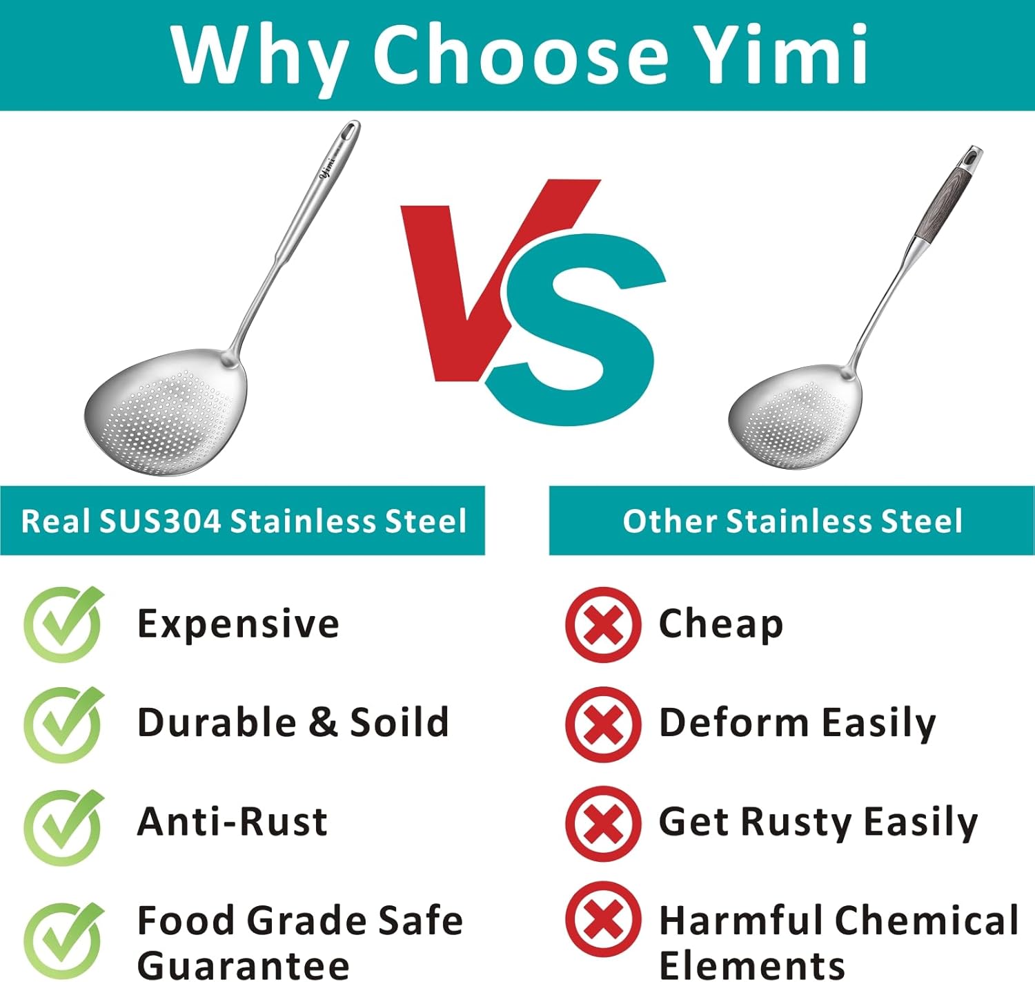 - REAL SUS304 FOOD GRADE STAINLESS STEEL - Compared to other stainless steel which includes harmful chemical elements, SUS 304 stainless steel is more durable and safe, heat resistant, corrosion resistant, BPA free, chemical free, but more expensive.You can use it to cook for baby without any worry. (SUS304 logo is on the handle)