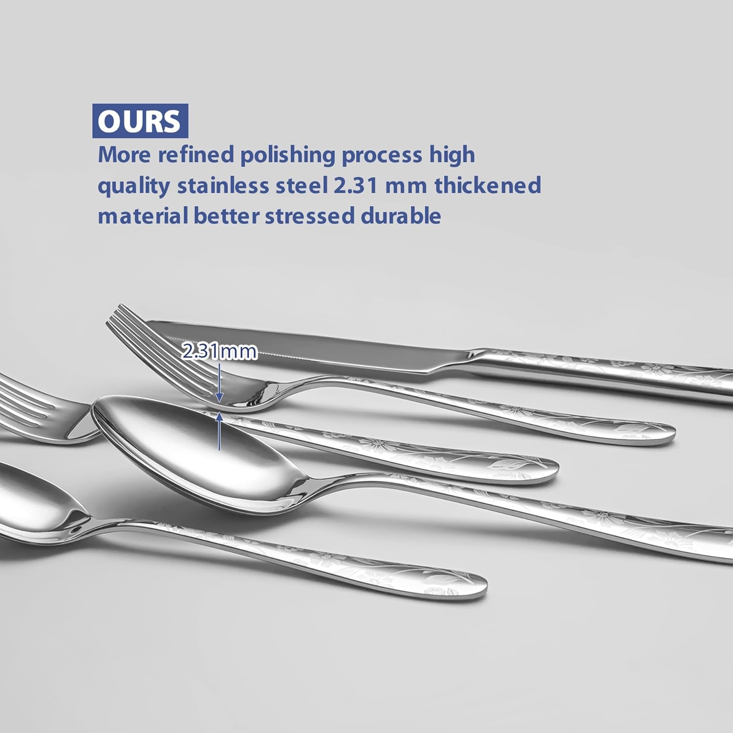 - ăUnique Silverware Set with Beautiful Pattern HandleăOur flatware set for 8 is designed with beautiful laser prints of flowers, unique styles make your dining table special, standing out from the ordinary tableware, and unique silver finish pattern design brings modern and stylish to the modern silverware set impresses your family and friends when they come round for dinner